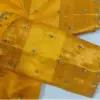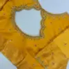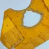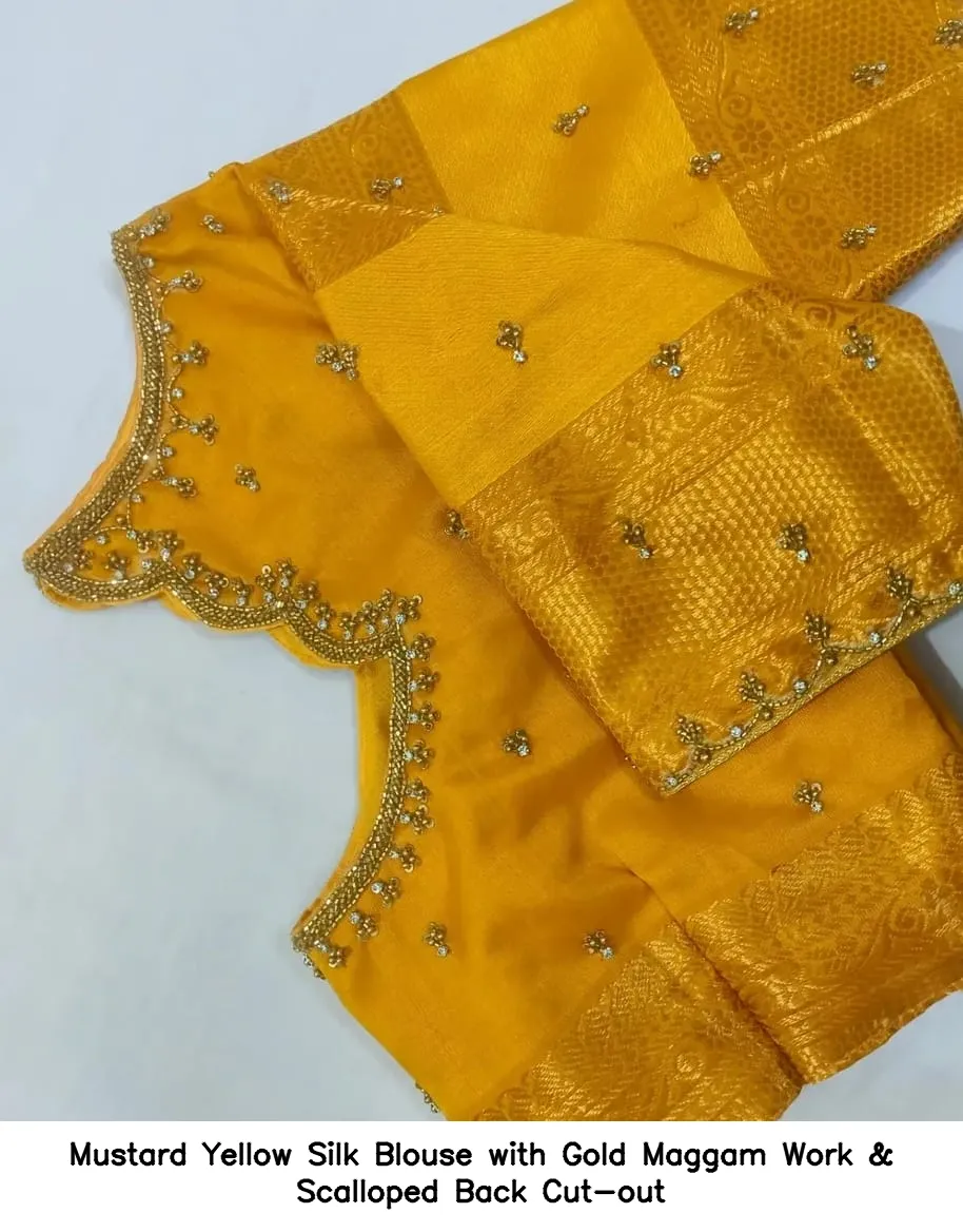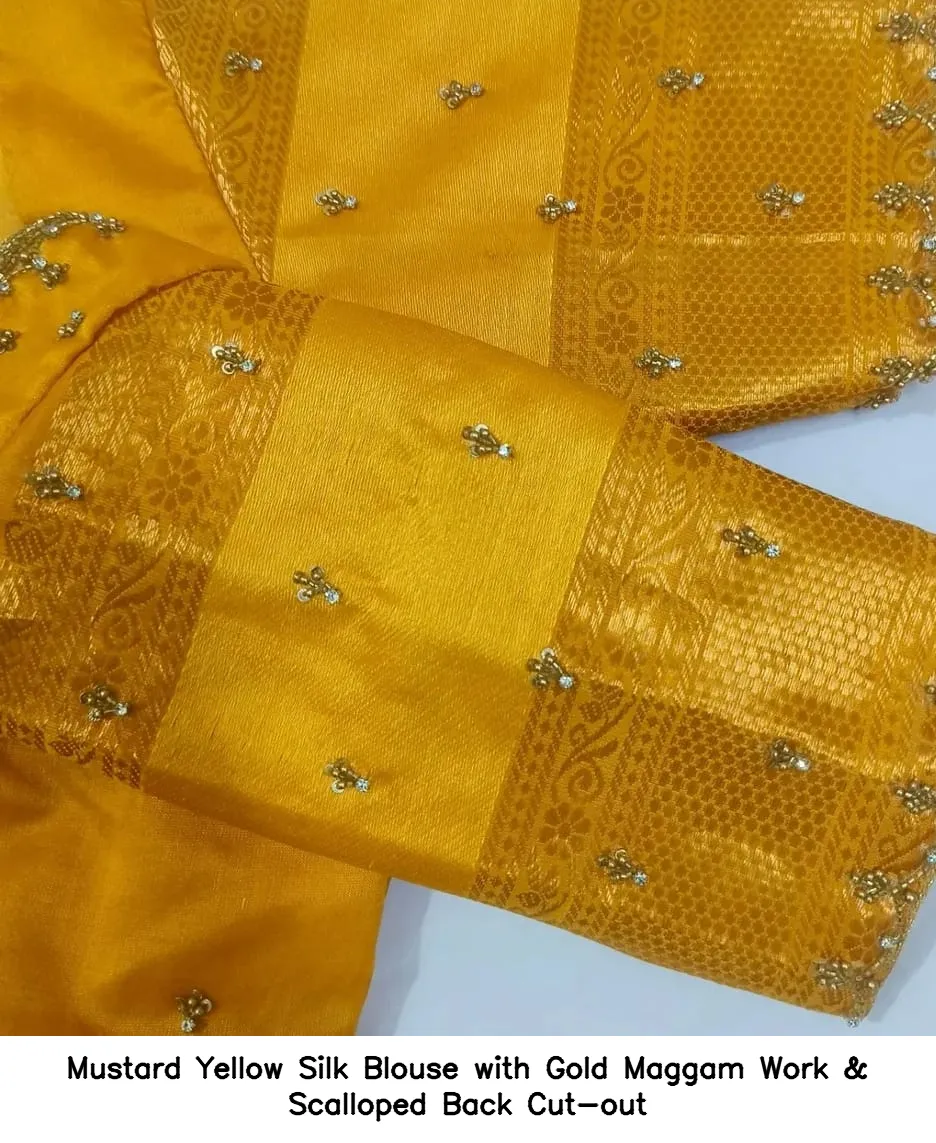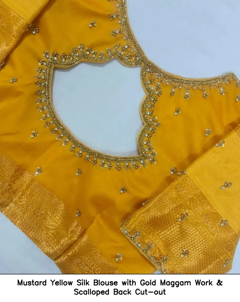 Product Name: Mustard Yellow Silk Blouse with Gold Maggam Work & Scalloped Back Cut-out