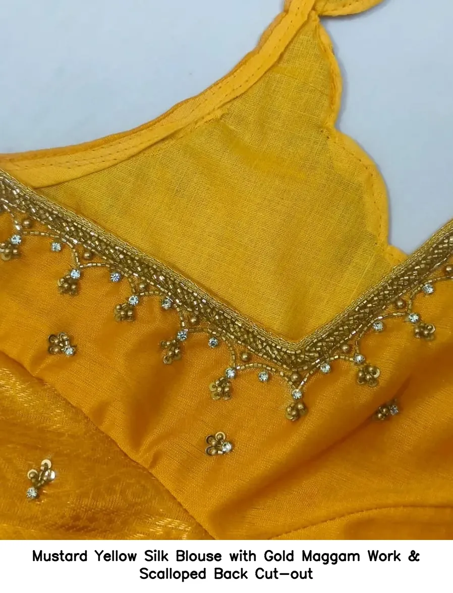 Mustard Yellow Silk Blouse with Gold Maggam Work & Scalloped Back Cut-out