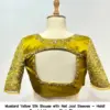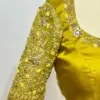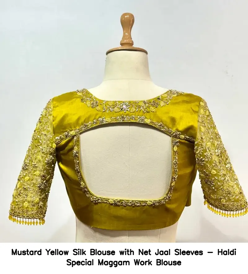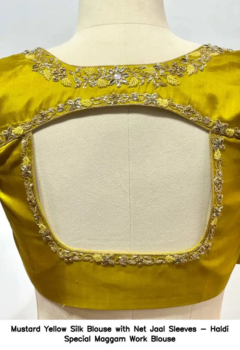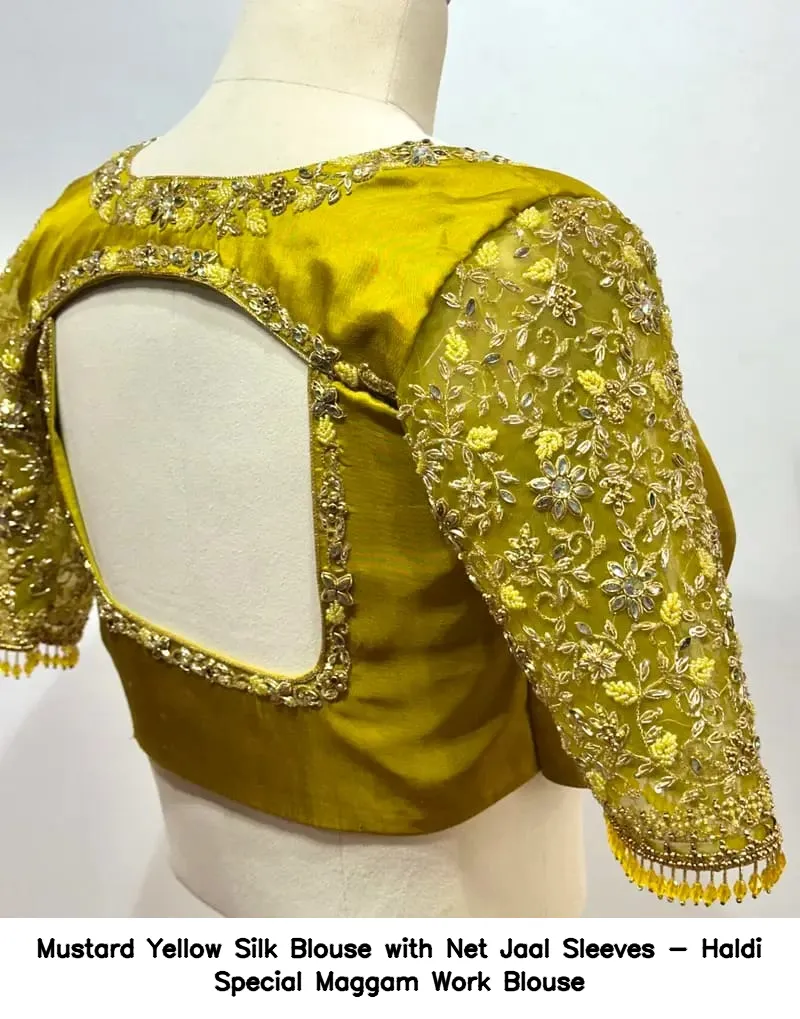​​​​​Mustard Yellow Silk Blouse with Net Jaal Sleeves – Haldi Special Maggam Work Blouse
