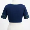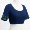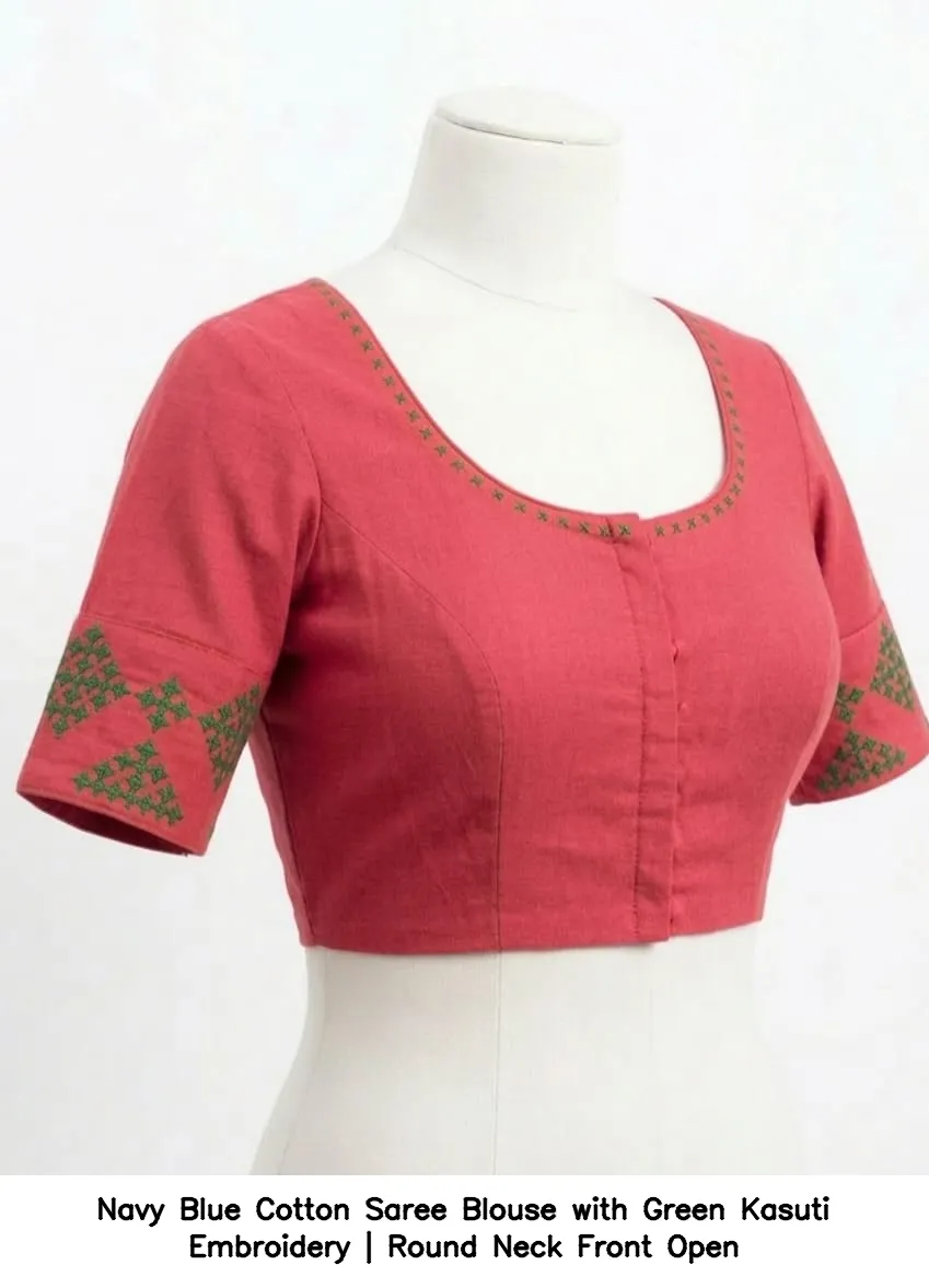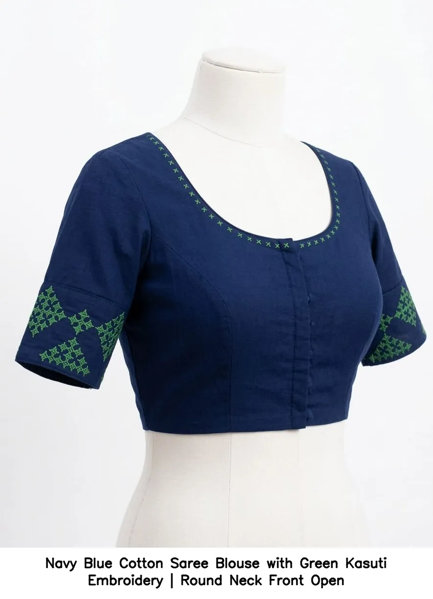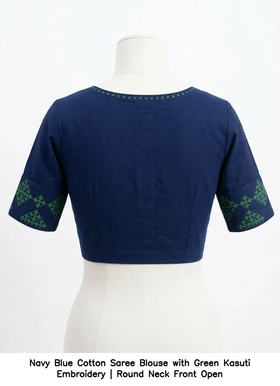 Product Name: Navy Blue Cotton Saree Blouse with Green Kasuti Embroidery | Round Neck Front Open