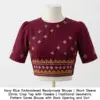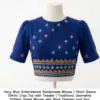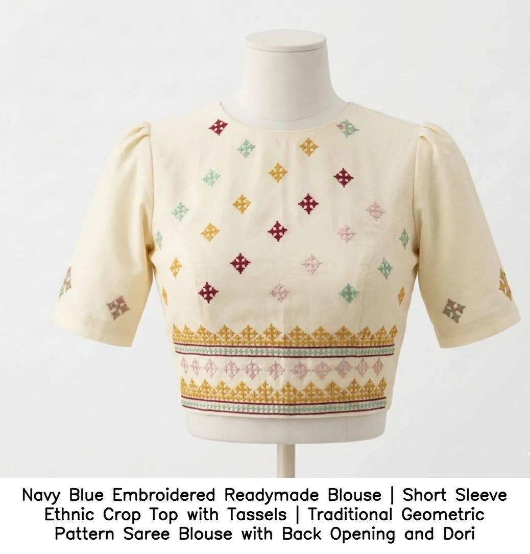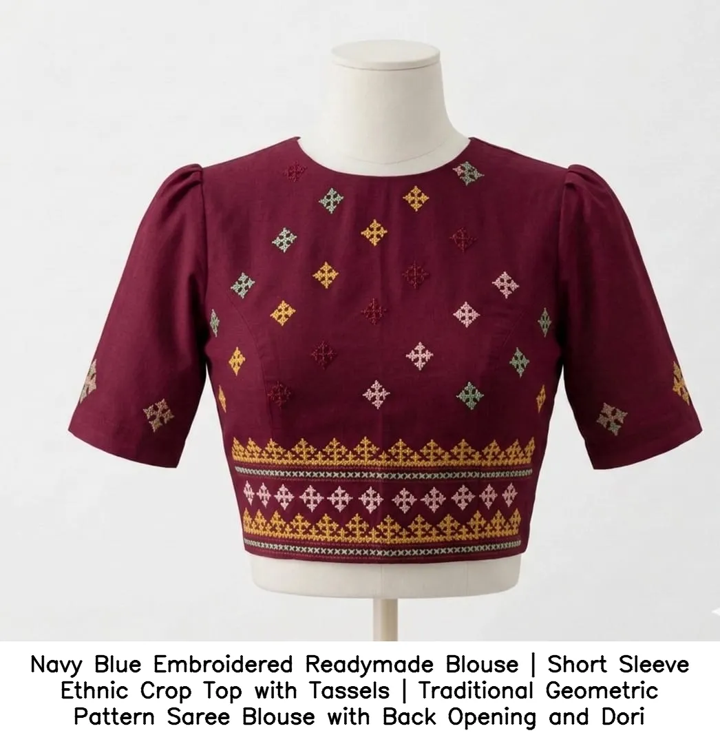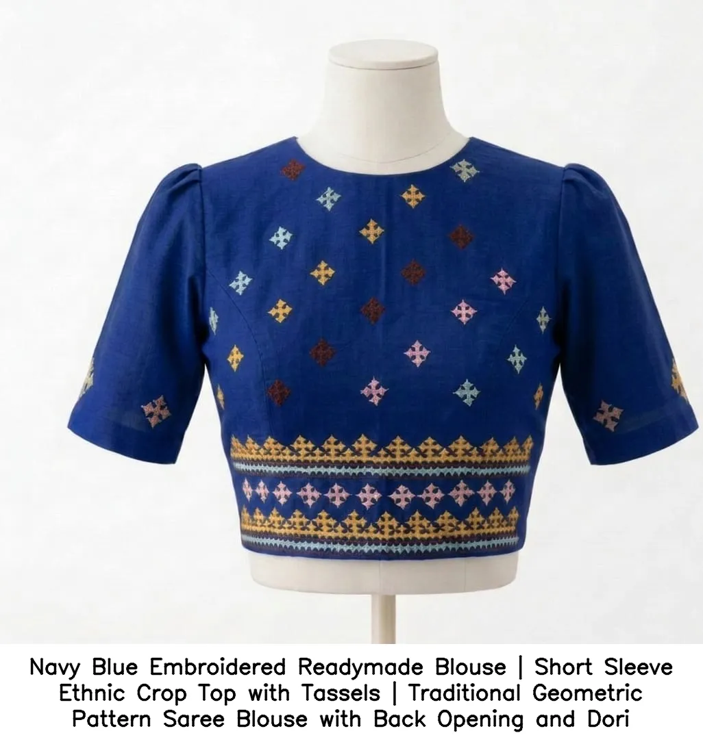 Product Name: ​​​​​​Navy Blue Embroidered Readymade Blouse | Short Sleeve Ethnic Crop Top with Tassels | Traditional Geometric Pattern Saree Blouse with Back Opening and Dori