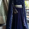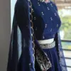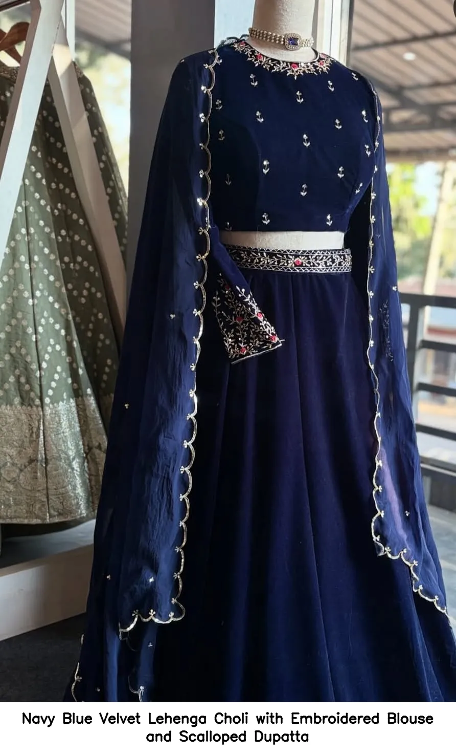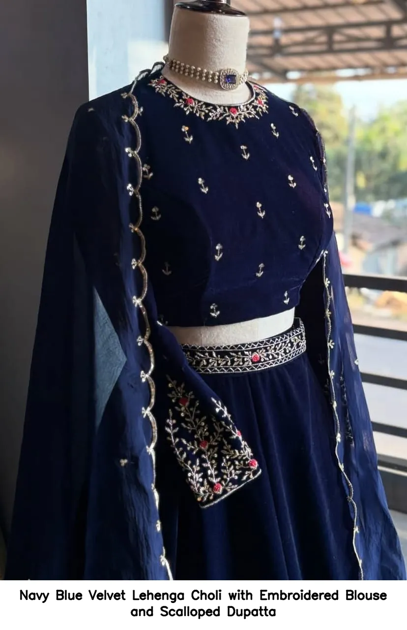 Navy Blue Velvet Lehenga Choli with Embroidered Blouse and Scalloped Dupatta