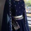 Product Name: Navy Blue Velvet Lehenga Choli with Embroidered Blouse and Scalloped Dupatta