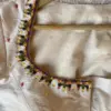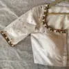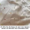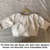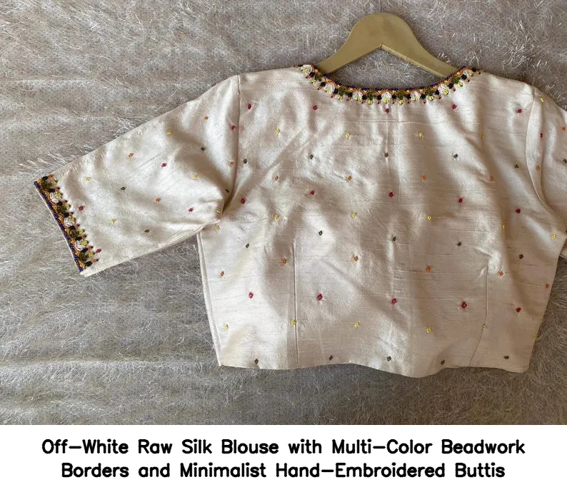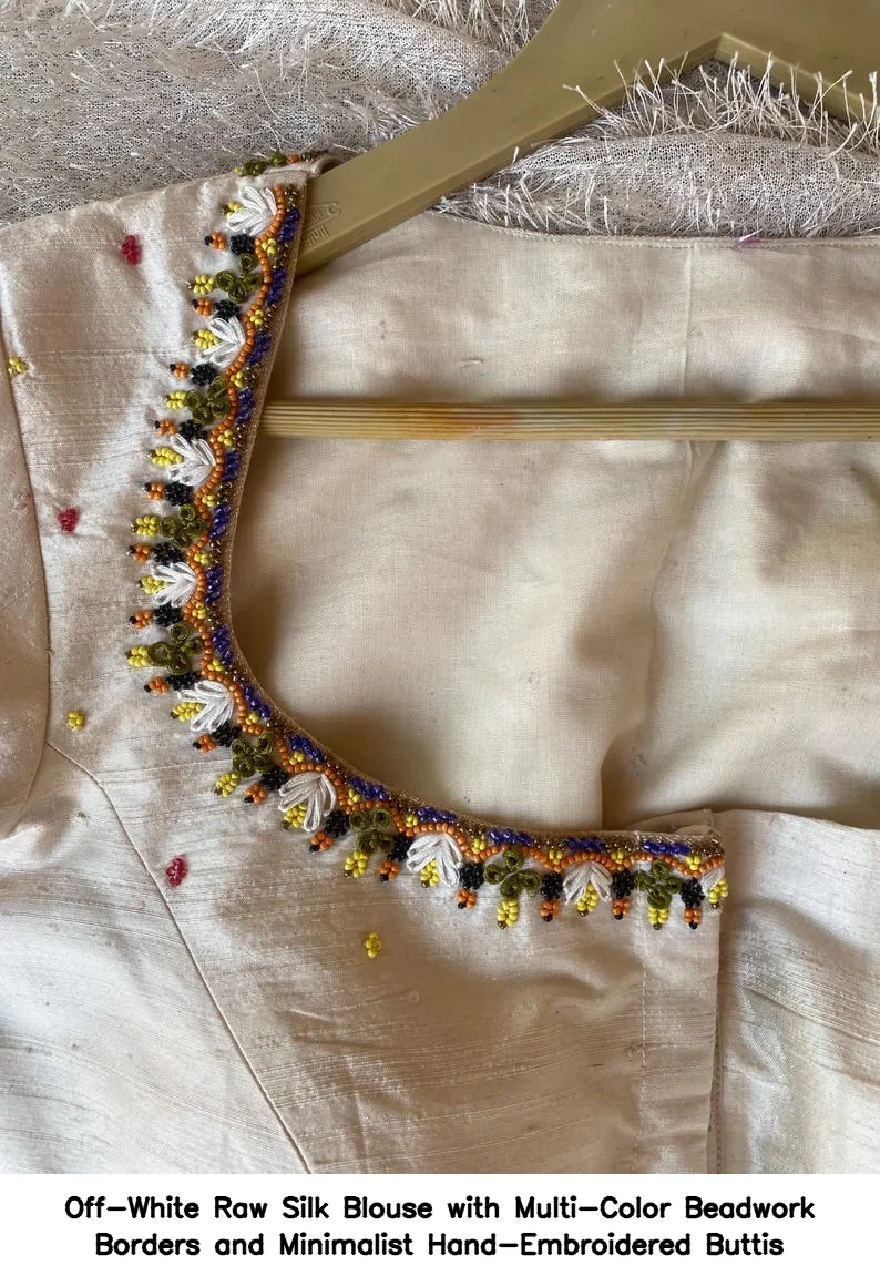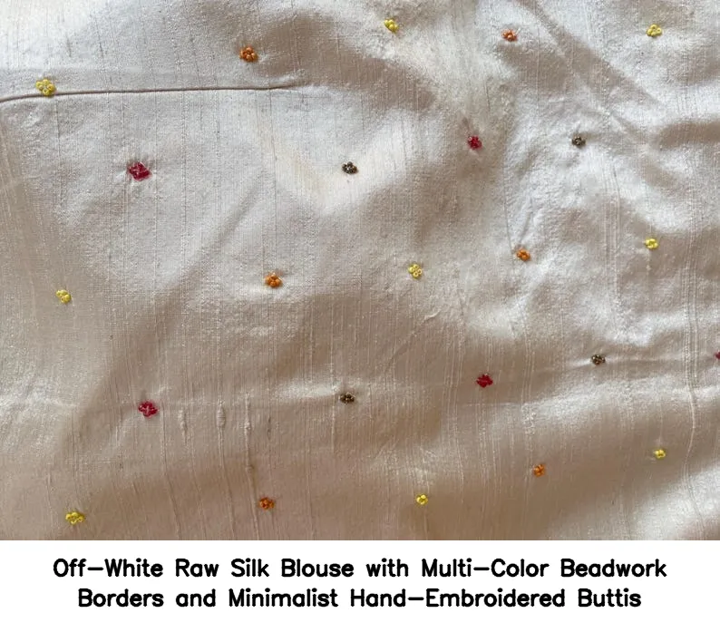 ​Off-White Raw Silk Blouse with Multi-Color Beadwork Borders and Minimalist Hand-Embroidered Buttis