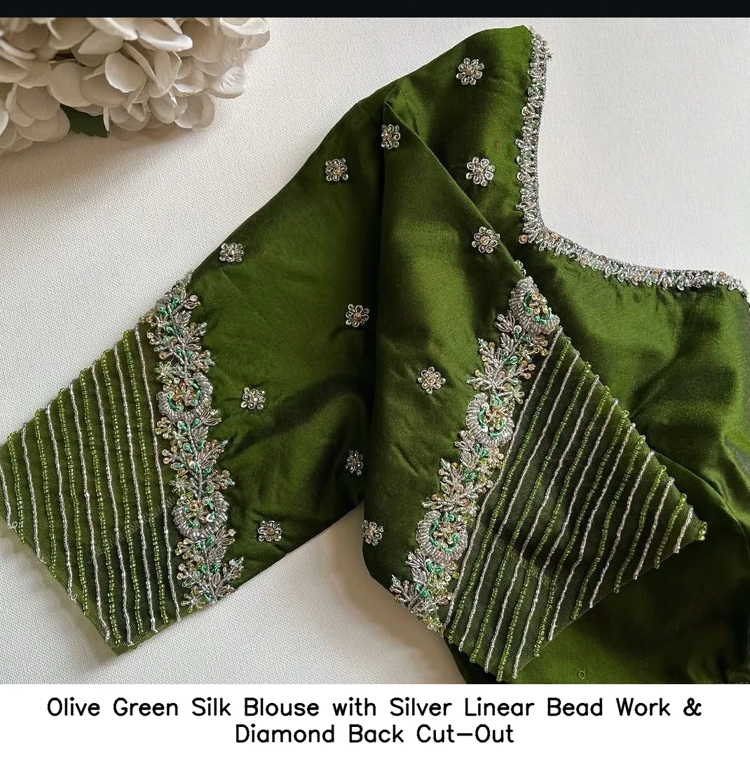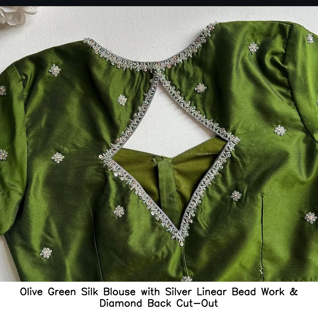 Olive Green Silk Blouse with Silver Linear Bead Work & Diamond Back Cut-Out