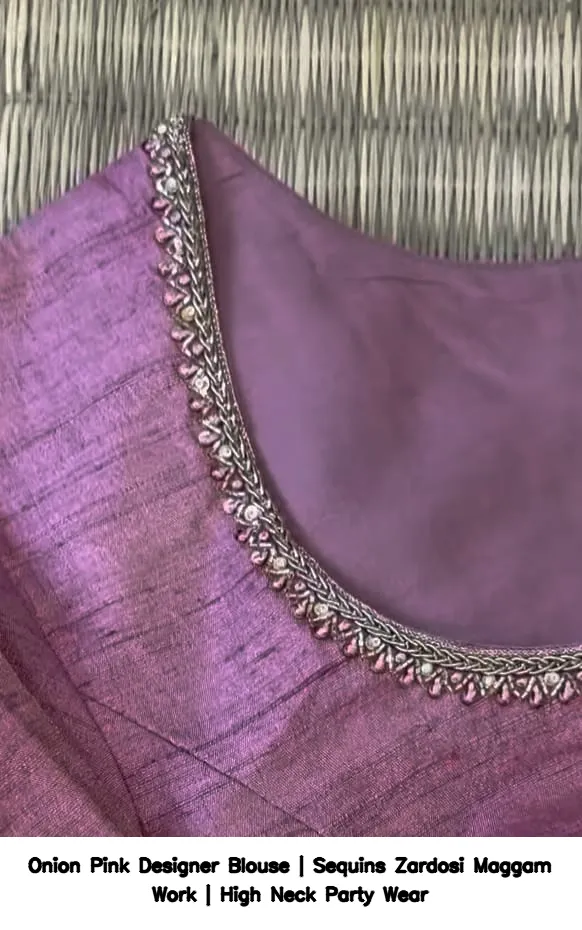 Add the Onion Pink Designer Blouse | Sequins Zardosi Maggam Work | High Neck Party Wear to your wardrobe today. Follow us for more updates and styles; follow us on Facebook to stay connected!
