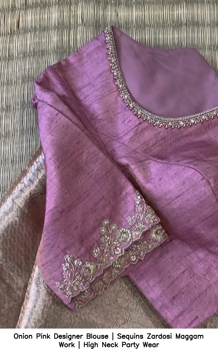 Q: What material is used in the Onion Pink Designer Blouse | Sequins Zardosi Maggam Work | High Neck Party Wear?