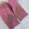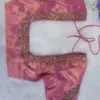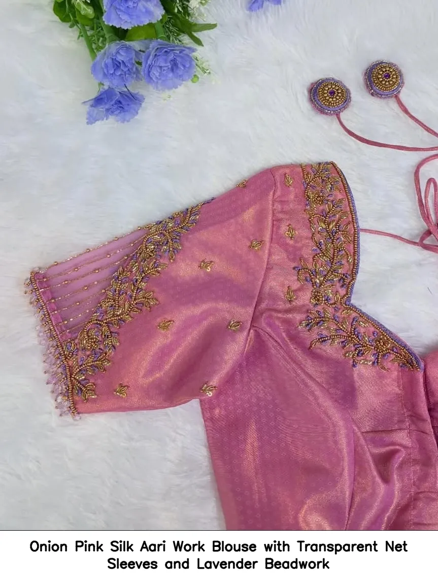Product Name: Onion Pink Silk Aari Work Blouse with Transparent Net Sleeves and Lavender Beadwork