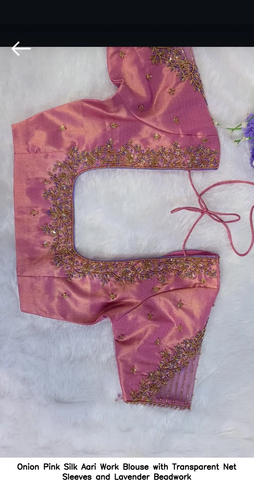 Onion Pink Silk Aari Work Blouse with Transparent Net Sleeves and Lavender Beadwork