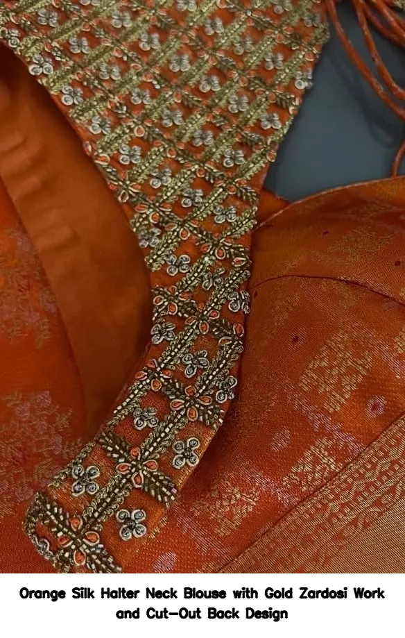 Why Choose Orange Silk Halter Neck Blouse with Gold Zardosi Work and Cut-Out Back Design?