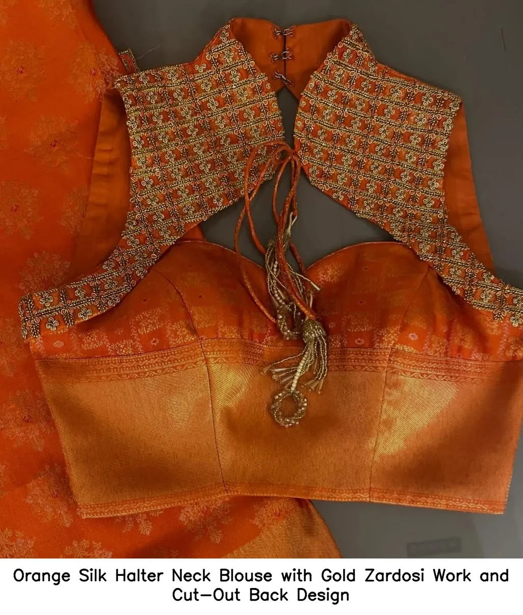 Product Name: Orange Silk Halter Neck Blouse with Gold Zardosi Work and Cut-Out Back Design