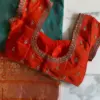 Product Name: Orange Silk Maggam Work Blouse with Scalloped Neck & Teal Kanjivaram Saree Set
