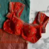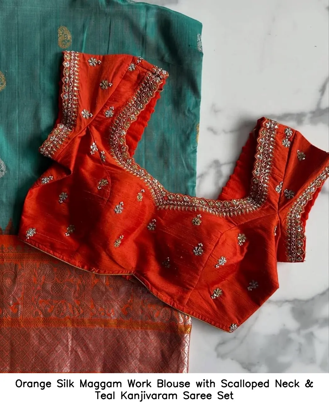 Orange Silk Maggam Work Blouse with Scalloped Neck & Teal Kanjivaram Saree Set