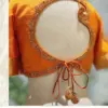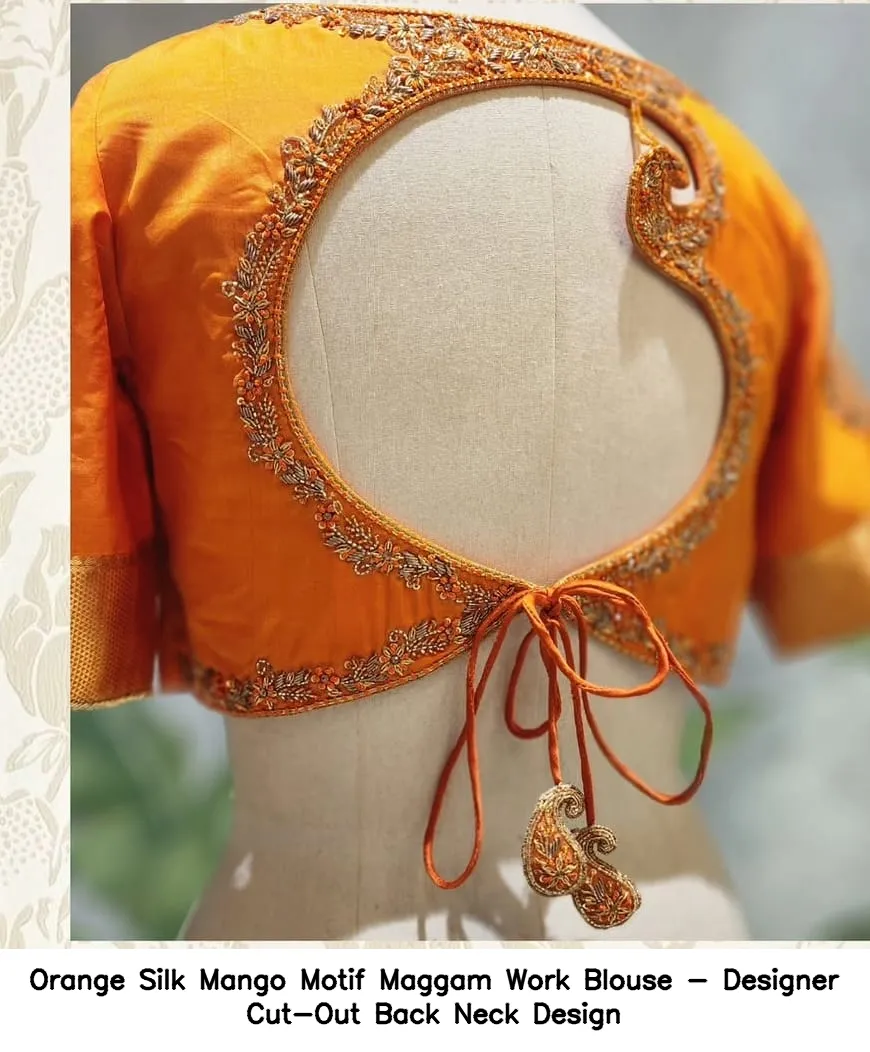 Product Name: Orange Silk Mango Motif Maggam Work Blouse – Designer Cut-Out Back Neck Design