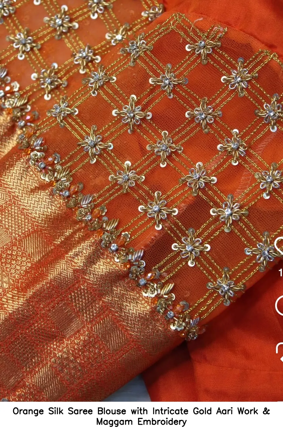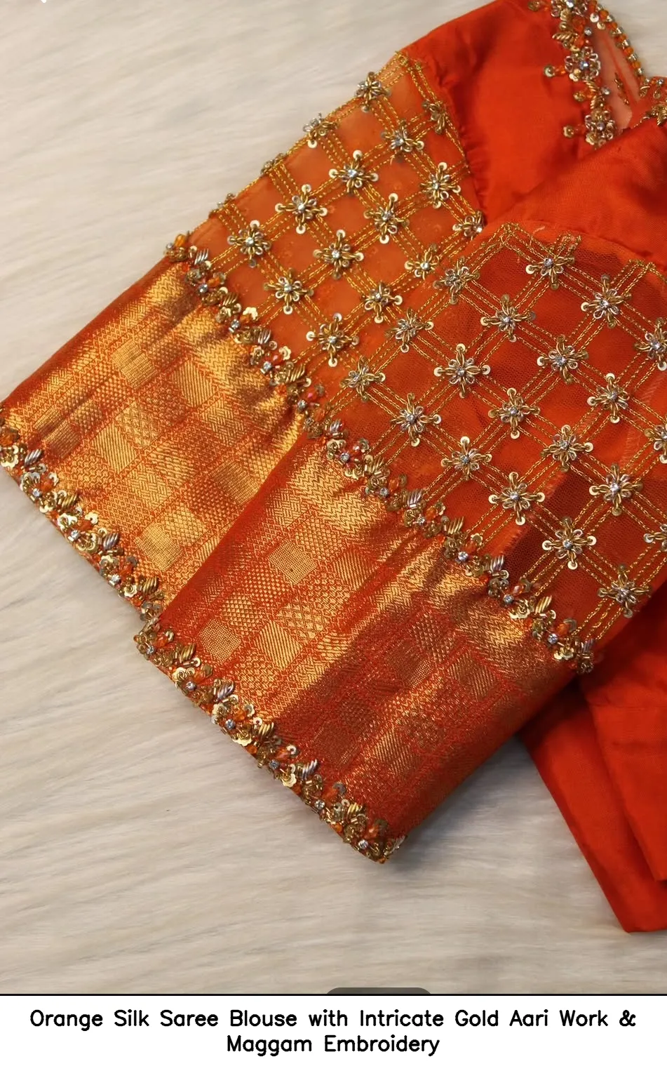 Orange Silk Saree Blouse with Intricate Gold Aari Work & Maggam Embroidery