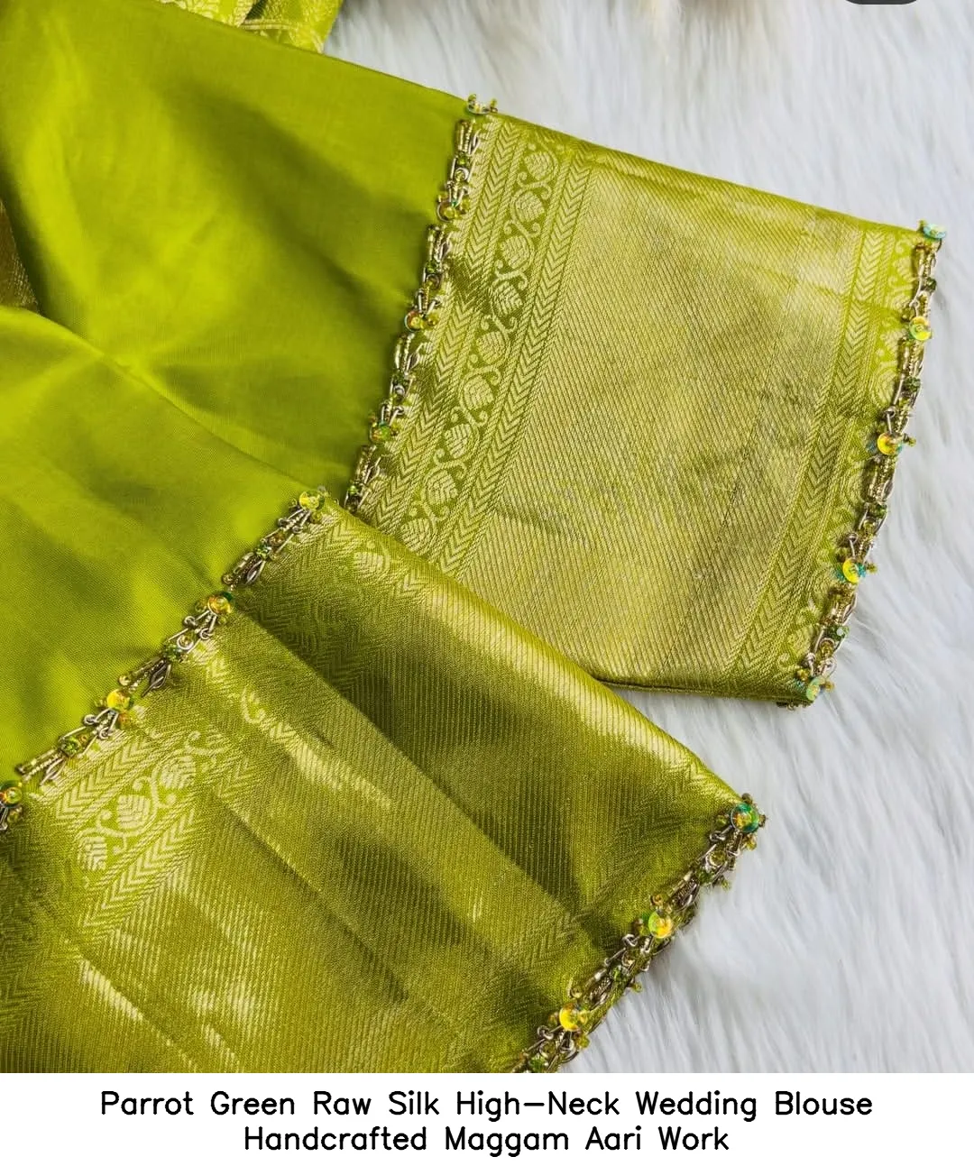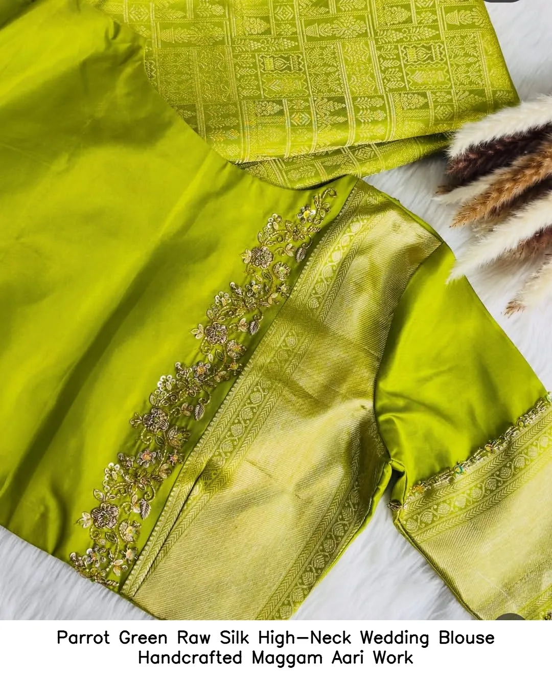 Why Choose Parrot Green Raw Silk High-Neck Wedding Blouse – Handcrafted Maggam Aari Work?