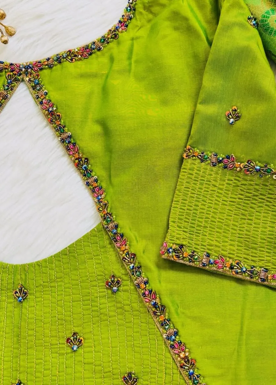 Why Choose Parrot Green Zardosi Maggam Work Blouse Simple Yet Grand Bridal Elegance?