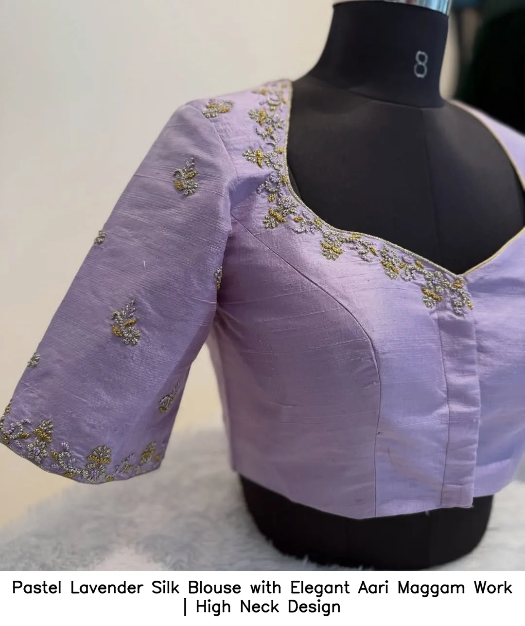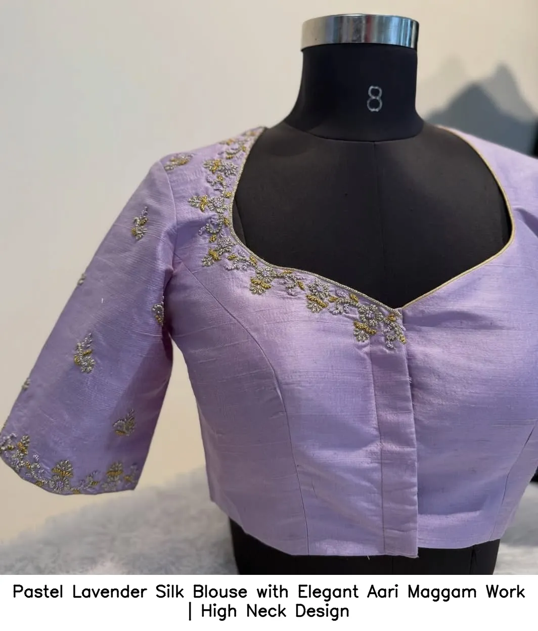 Pastel Lavender Silk Blouse with Elegant Aari Maggam Work | High Neck Design Features and Benefits