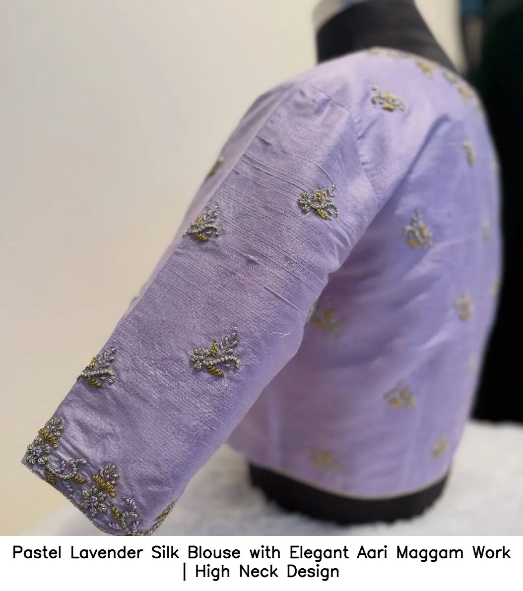 Why Choose Pastel Lavender Silk Blouse with Elegant Aari Maggam Work | High Neck Design?