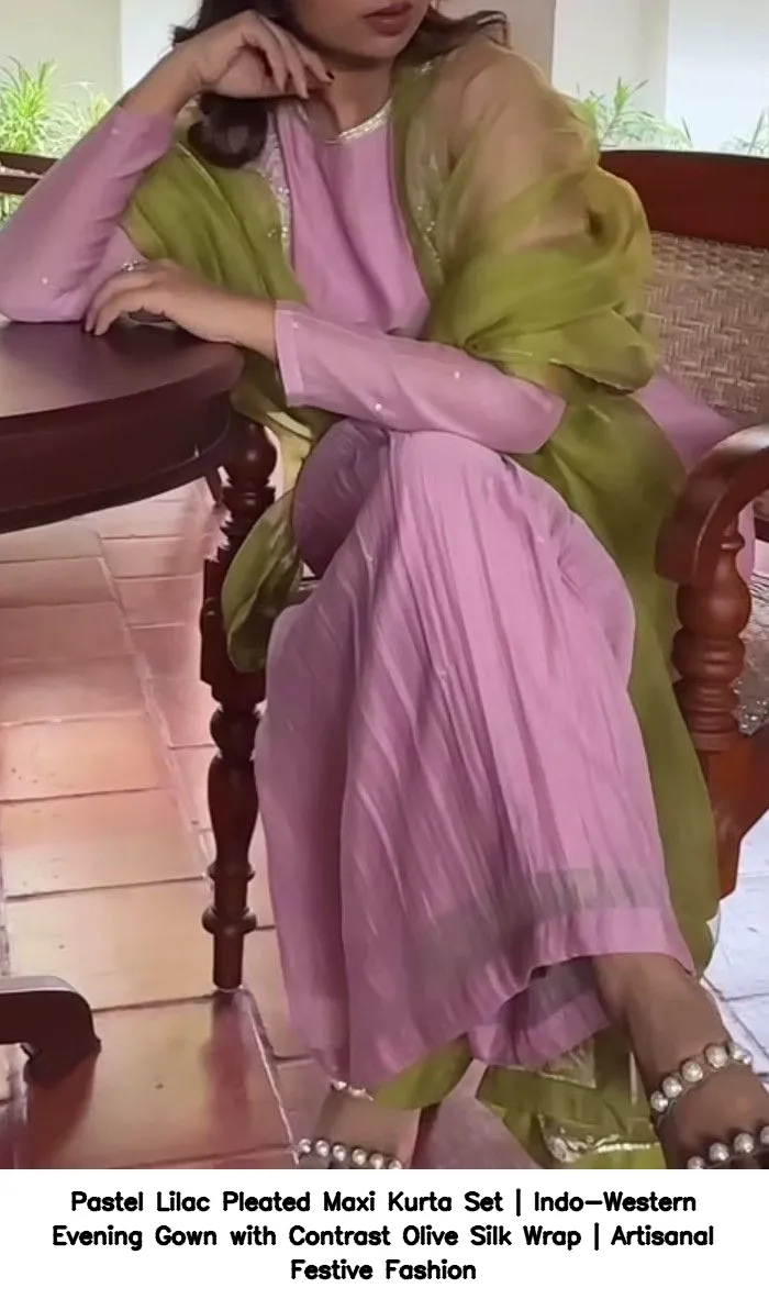 ​​Pastel Lilac Pleated Maxi Kurta Set | Indo-Western Evening Gown with Contrast Olive Silk Wrap | Artisanal Festive Fashion