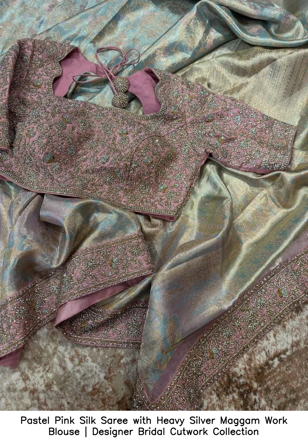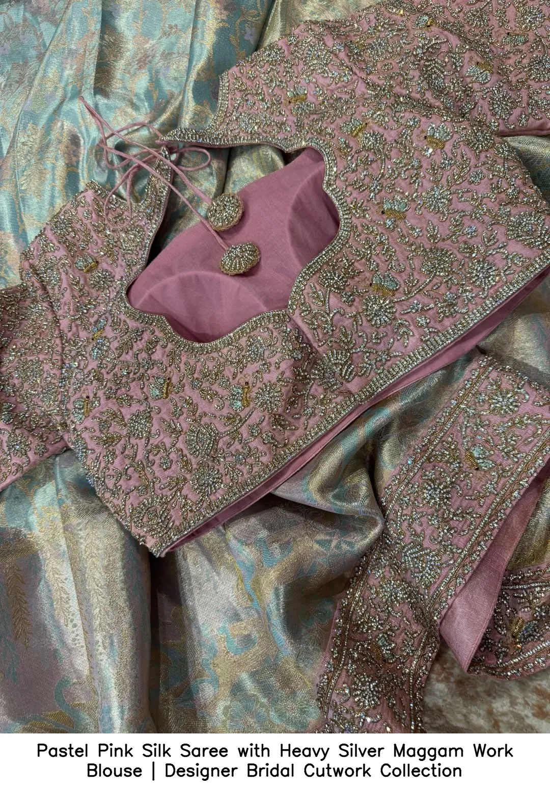 Pastel Pink Silk Saree with Heavy Silver Maggam Work Blouse | Designer Bridal Cutwork Collection