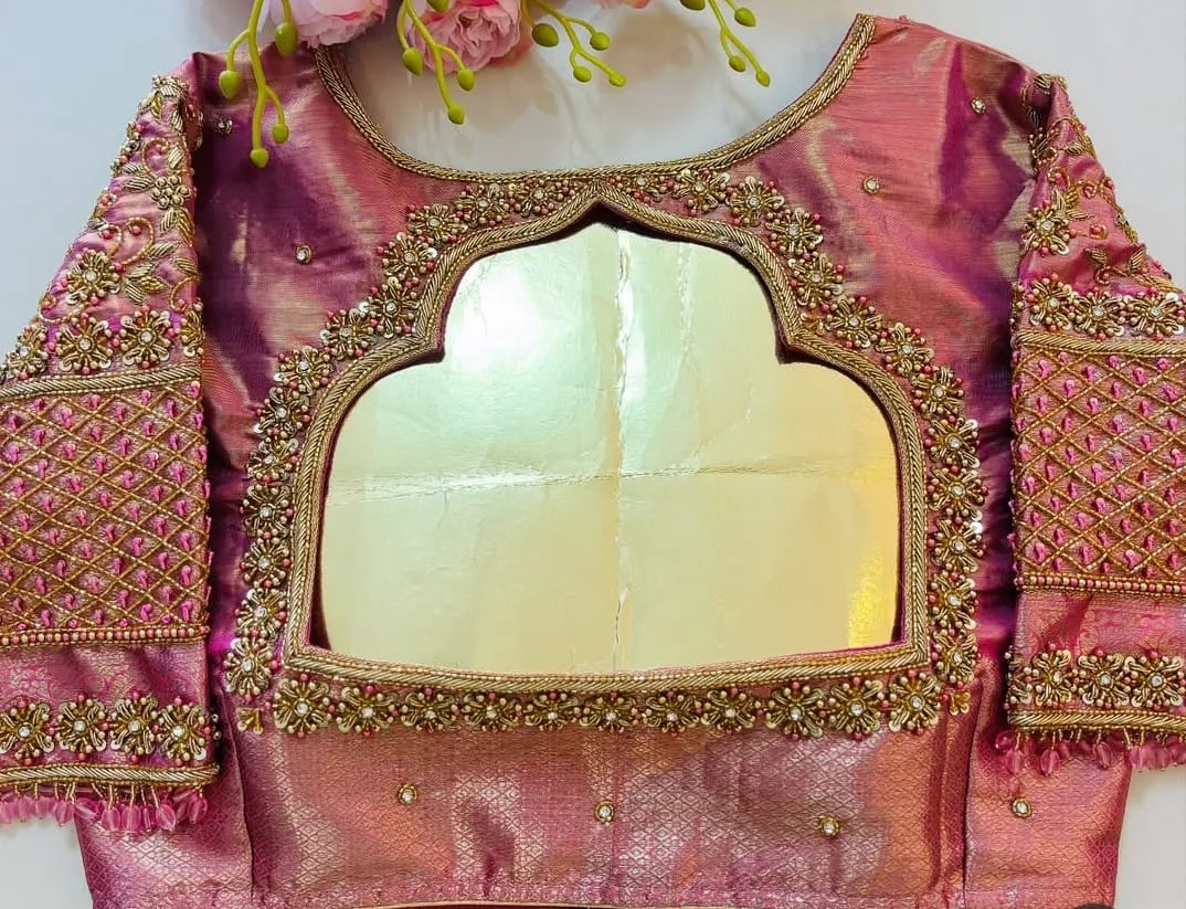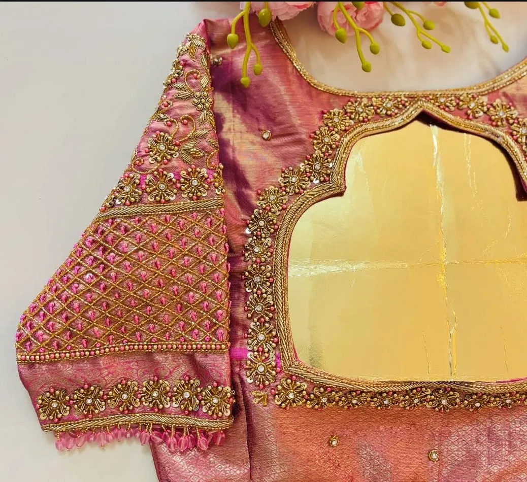 Stunning Peach Raw Silk with Maggam Work blouse. Crafted for bridal wear, pairs beautifully with silk sarees and lehengas.