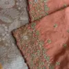 Q: What is the quality of the material used in the Peach Bridal Silk Zardosi Blouse – Front Open Deep Neck?