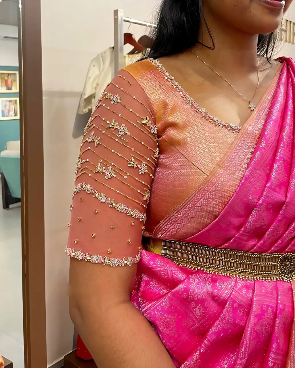 Product Name: Peach Net Wedding Maggam Work Blouse Premium Bridal Design at Best Price Custom Sizes Available