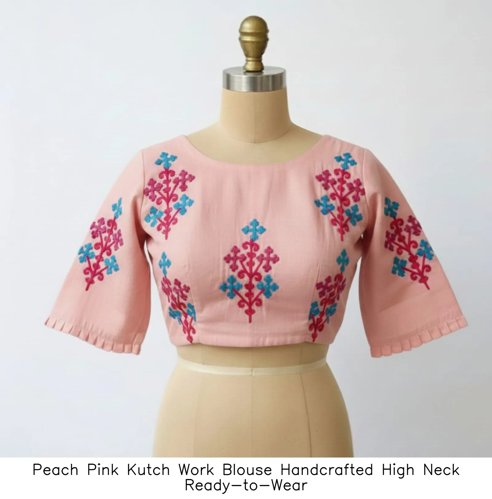 Peach Pink Kutch Work Blouse Handcrafted High Neck Ready-to-Wear