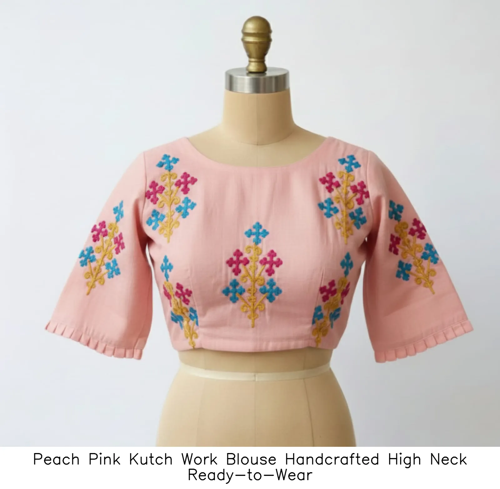 Product Name: Peach Pink Kutch Work Blouse Handcrafted High Neck Ready-to-Wear