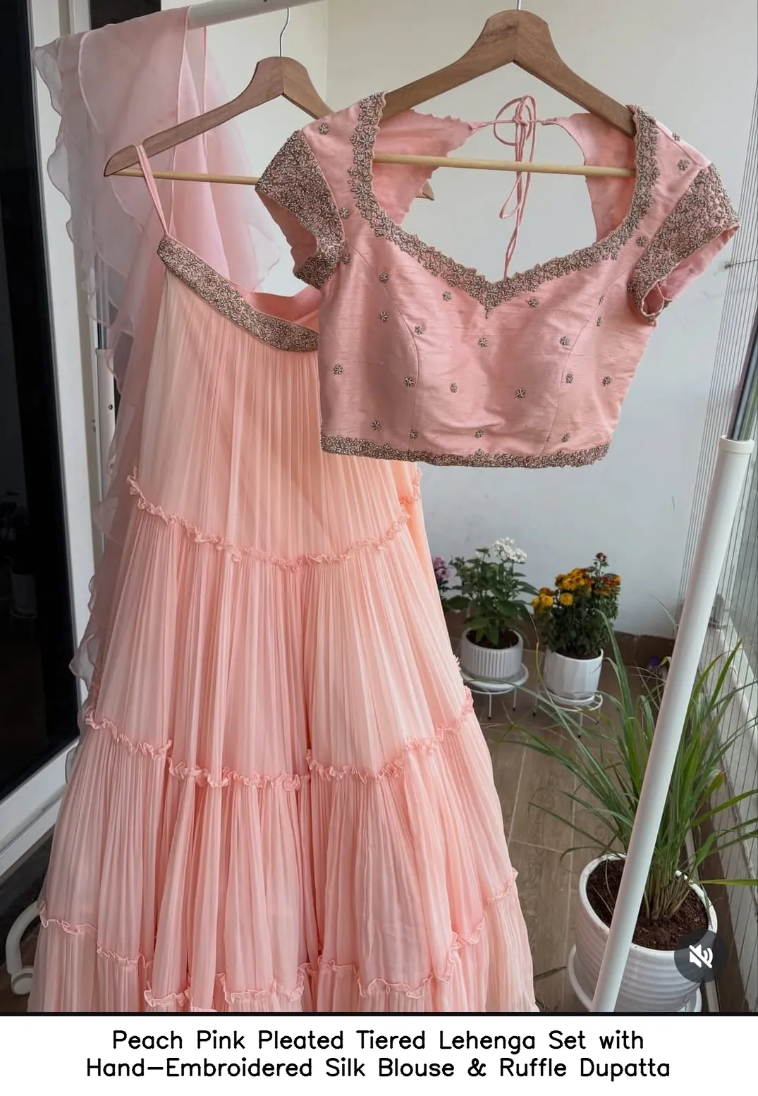 Peach Pink Pleated Tiered Lehenga Set with Hand-Embroidered Silk Blouse & Ruffle Dupatta