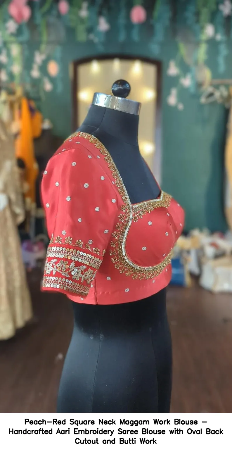 Product Name: ​​Peach-Red Square Neck Maggam Work Blouse – Handcrafted Aari Embroidery Saree Blouse with Oval Back Cutout and Butti Work