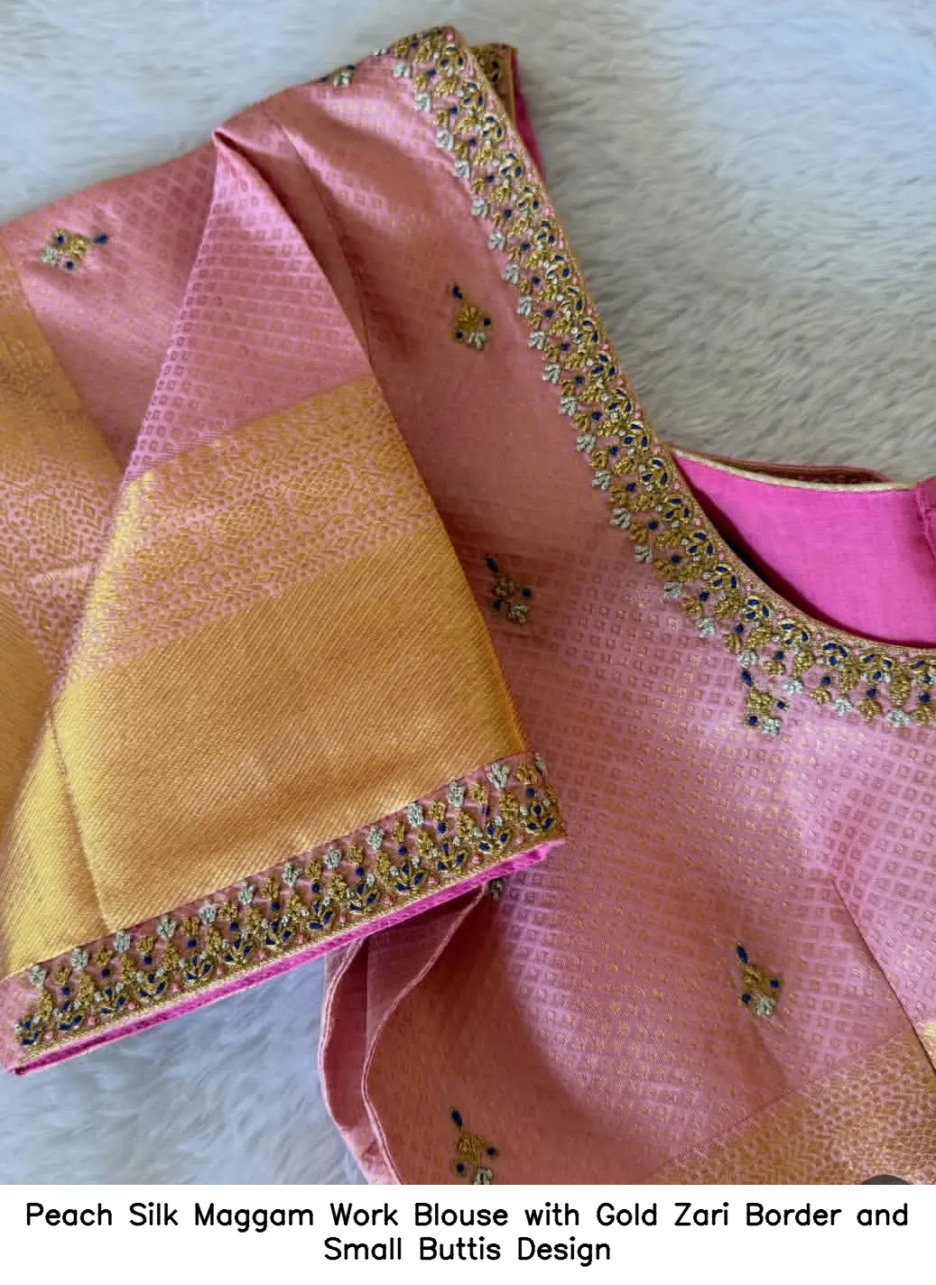 - Product Name: Peach Silk Maggam Work Blouse with Gold Zari Border and Small Buttis Design
