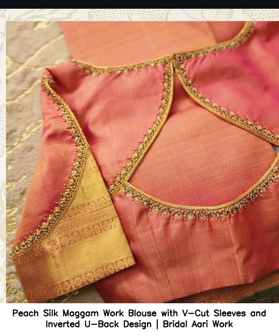 Introducing the stunning Peach Silk Maggam Work Blouse with V-Cut Sleeves and Inverted U-Back Design | Bridal Aari Work. This exquisite blouse is perfect for brides who wish to make a statement on their special day. Crafted from high-quality silk, it features intricate maggam work that adds elegance and charm.