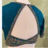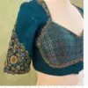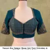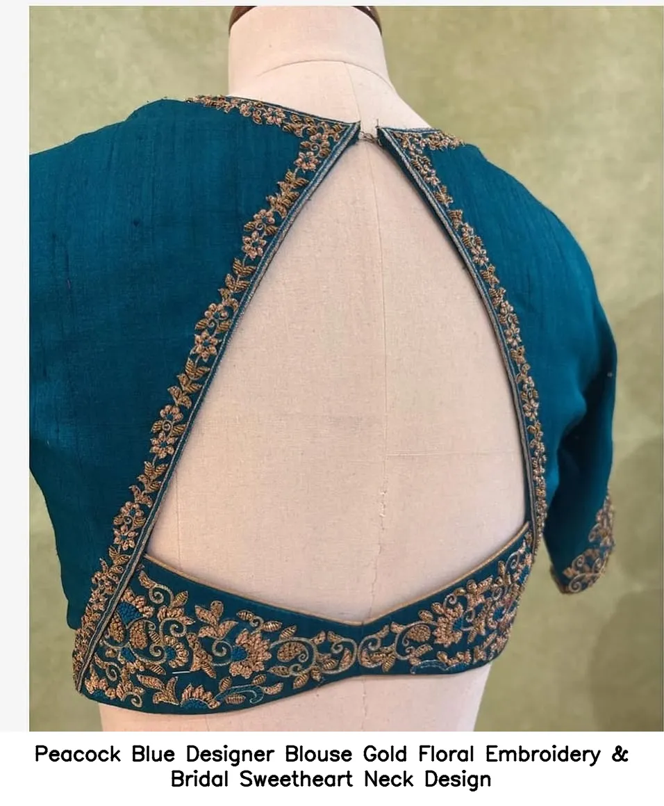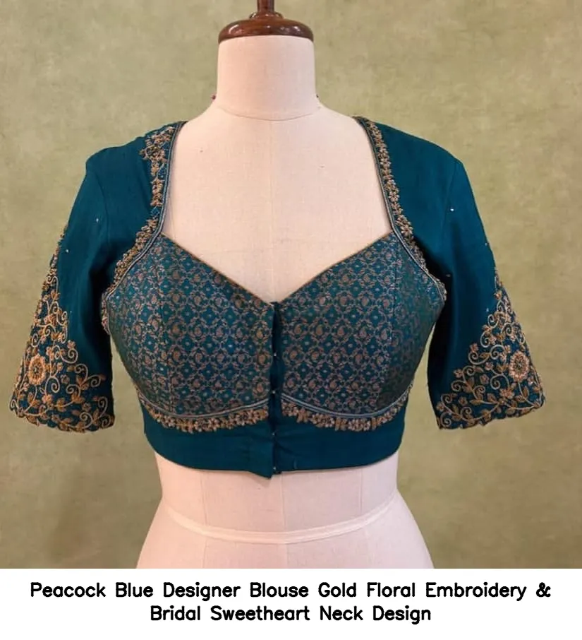 Peacock Blue Designer Blouse – Gold Floral Embroidery & Bridal Sweetheart Neck Design