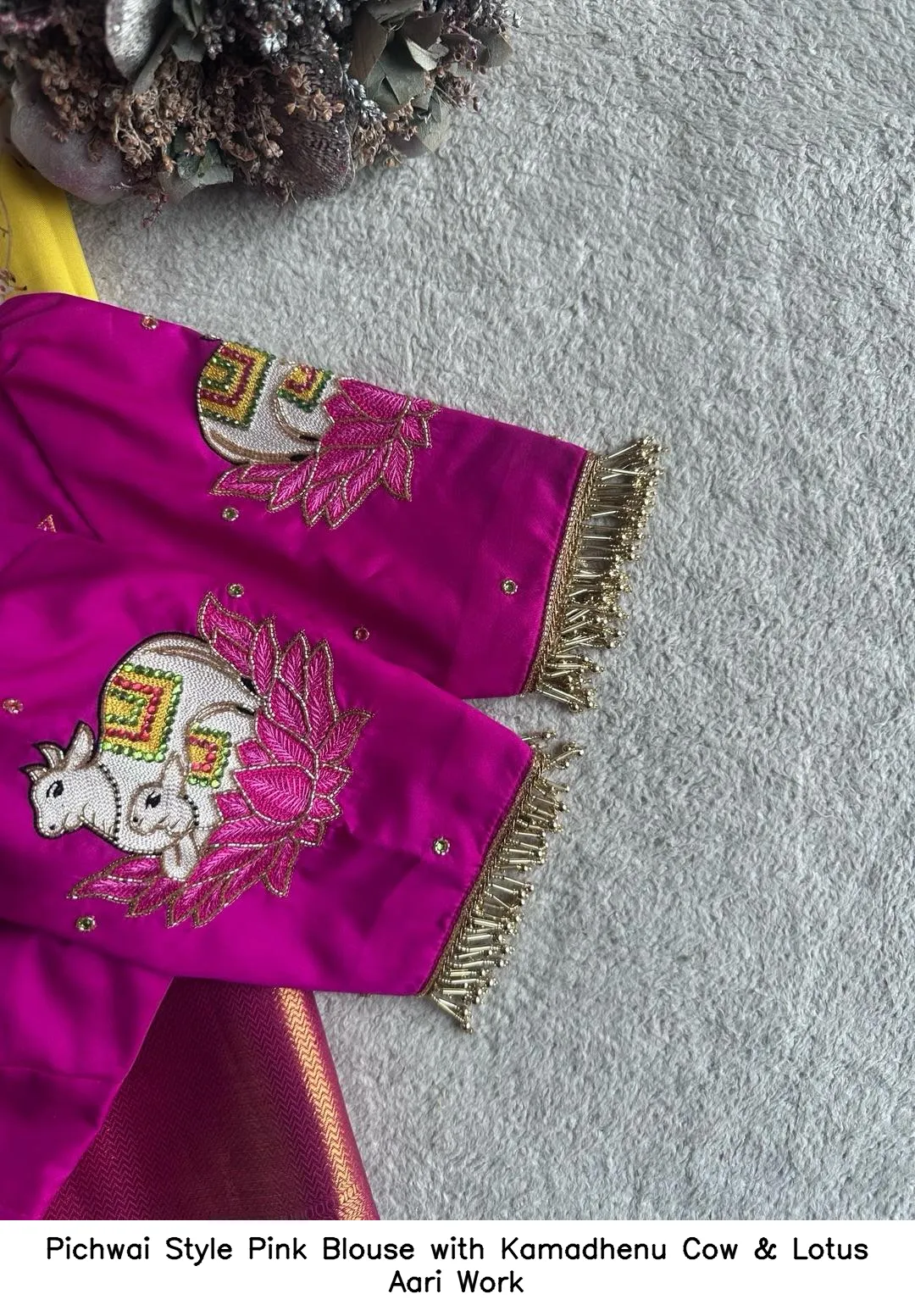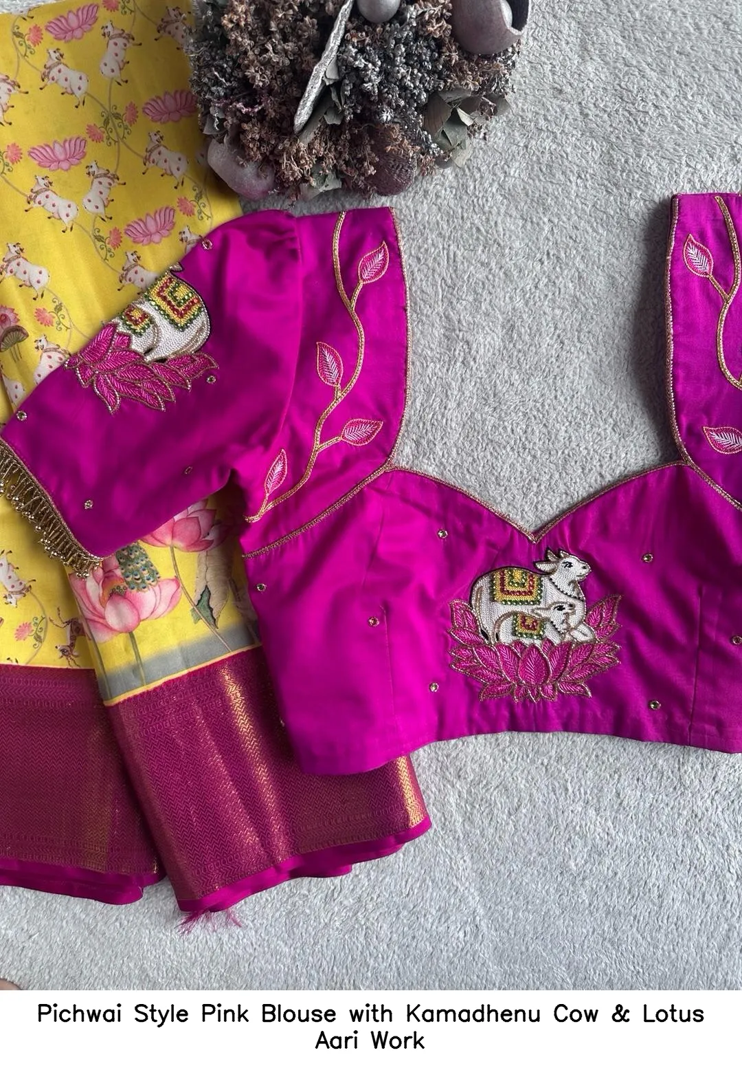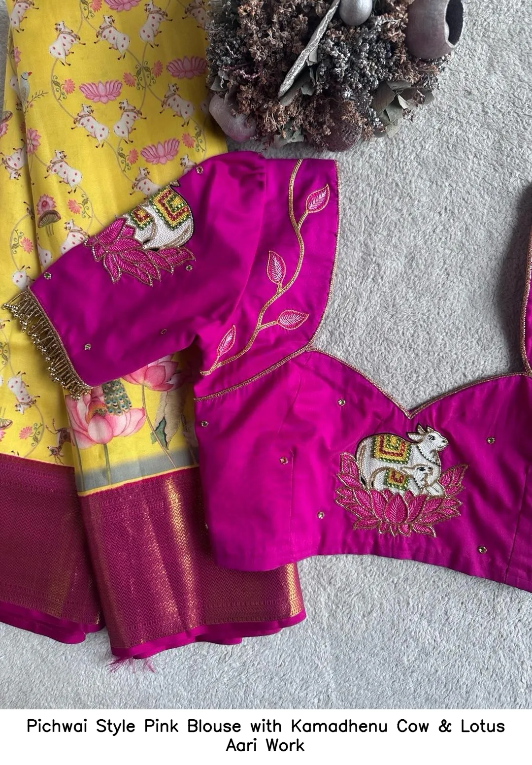 Pichwai Style Pink Blouse with Kamadhenu Cow & Lotus Aari Work
