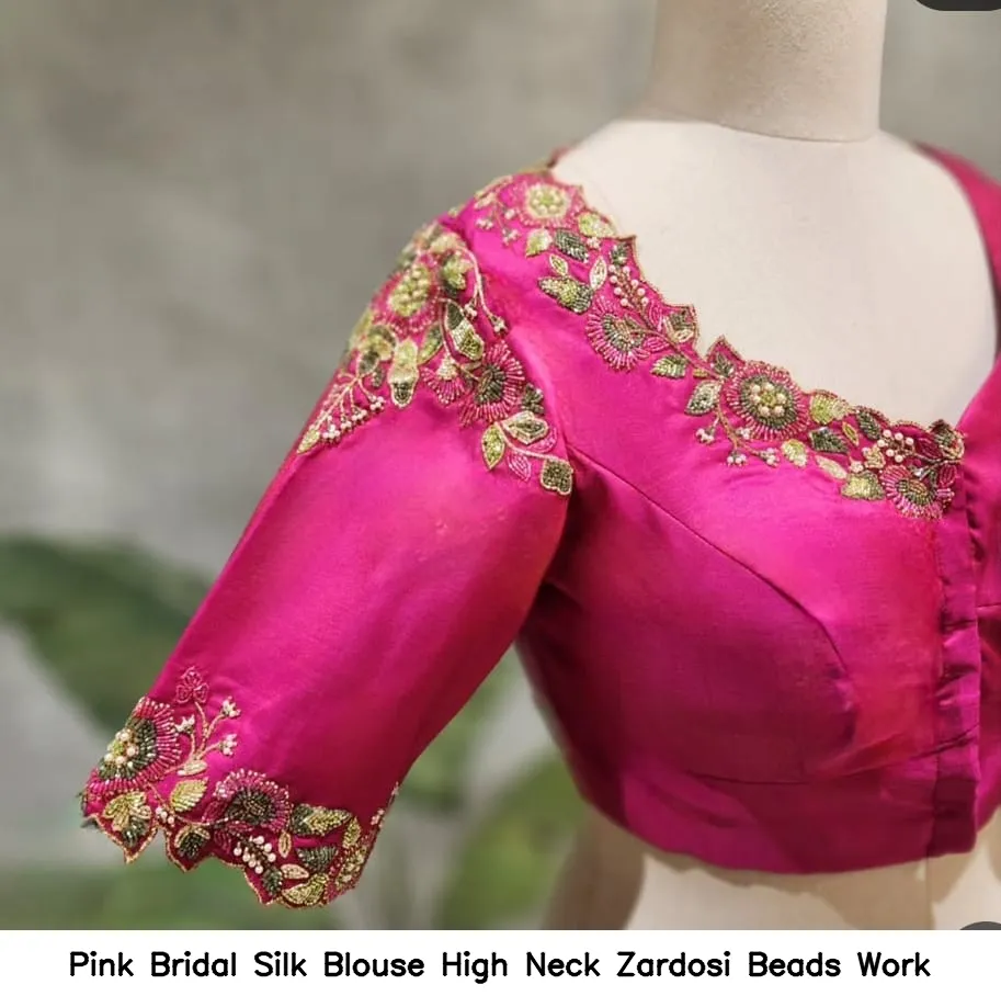 Pink Bridal Silk Blouse – High Neck Zardosi Beads Work