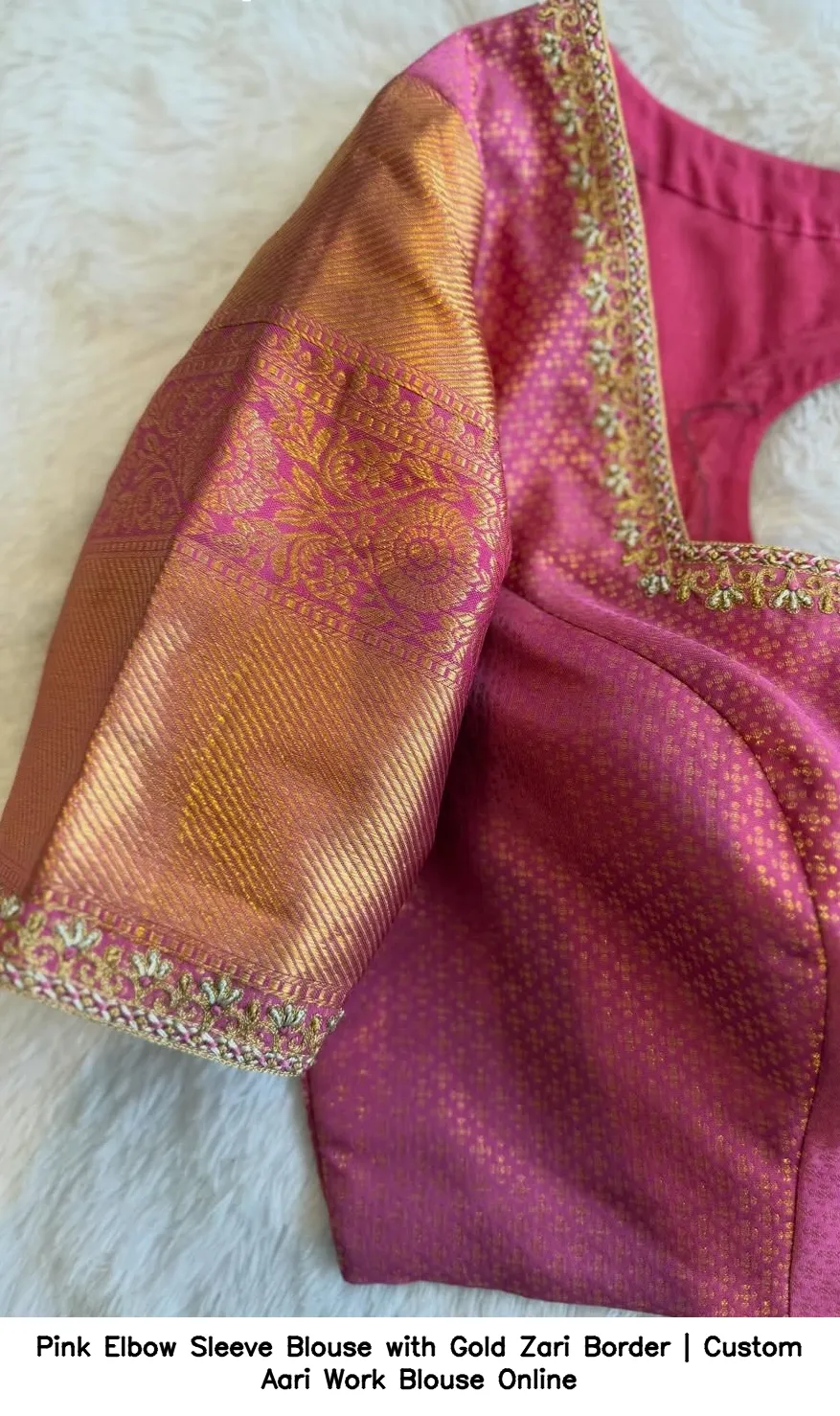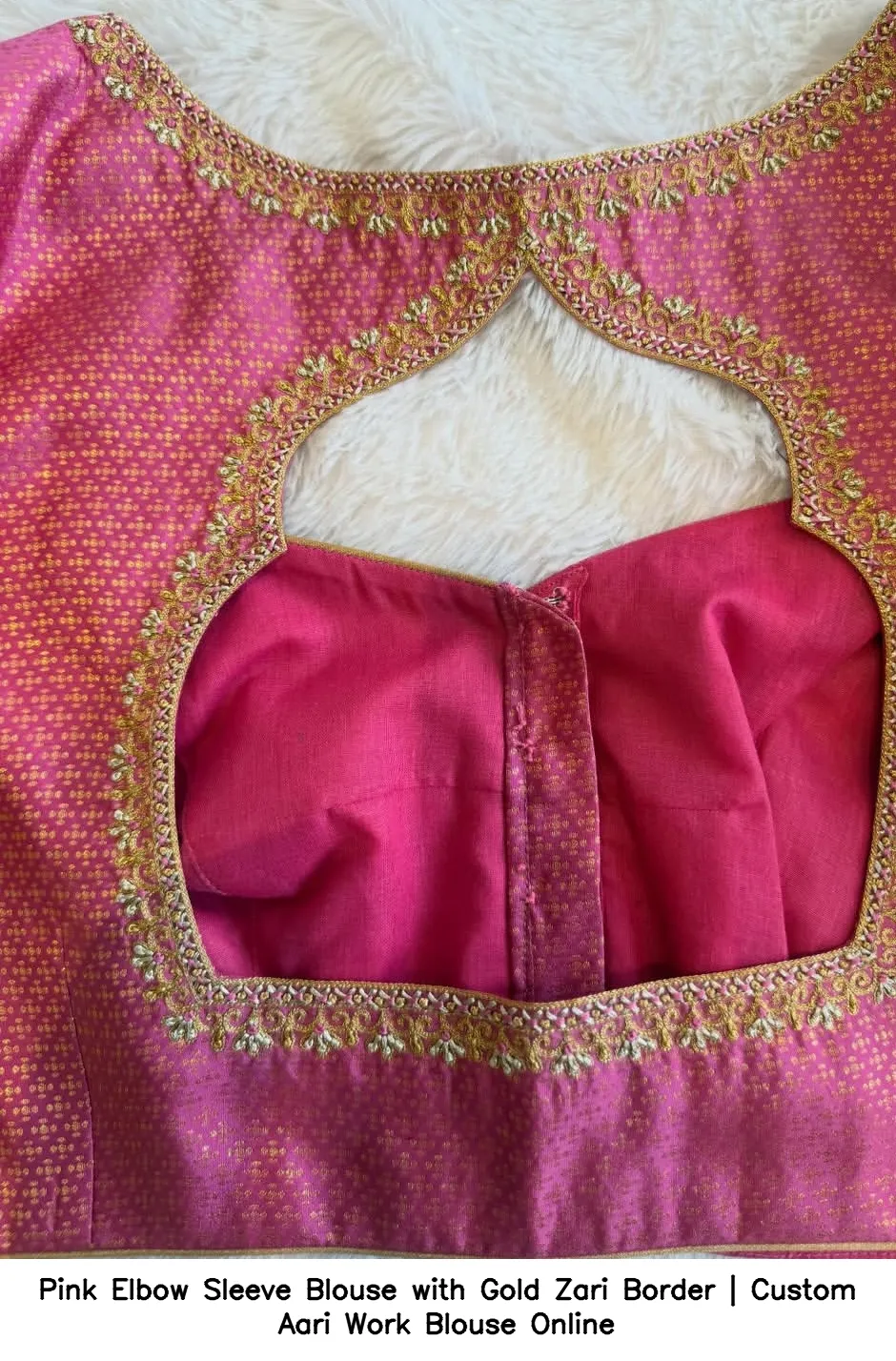 Pink Elbow Sleeve Blouse with Gold Zari Border | Custom Aari Work Blouse Online