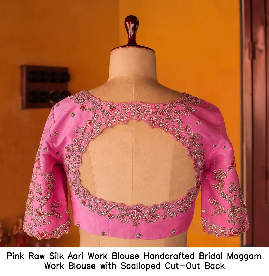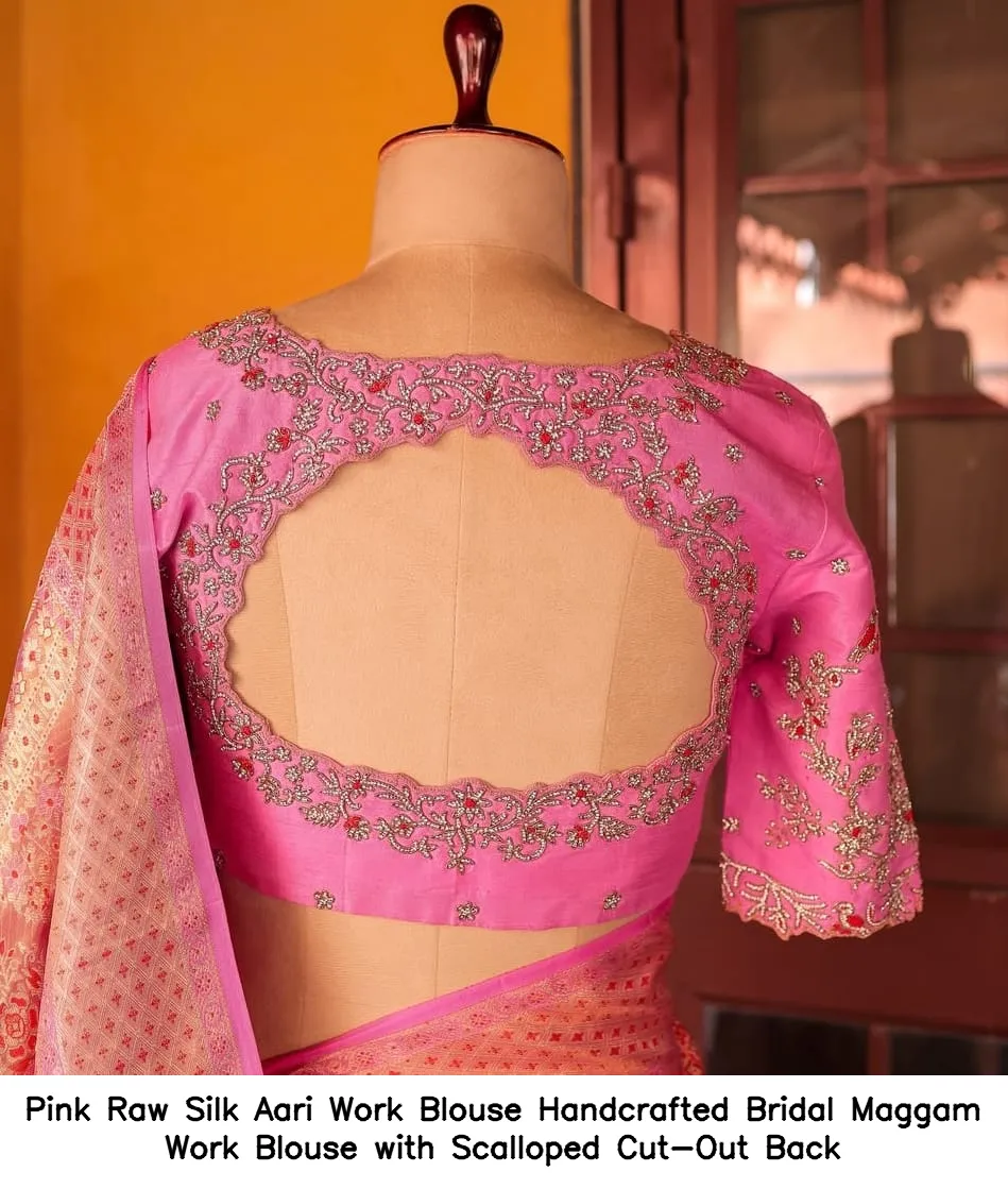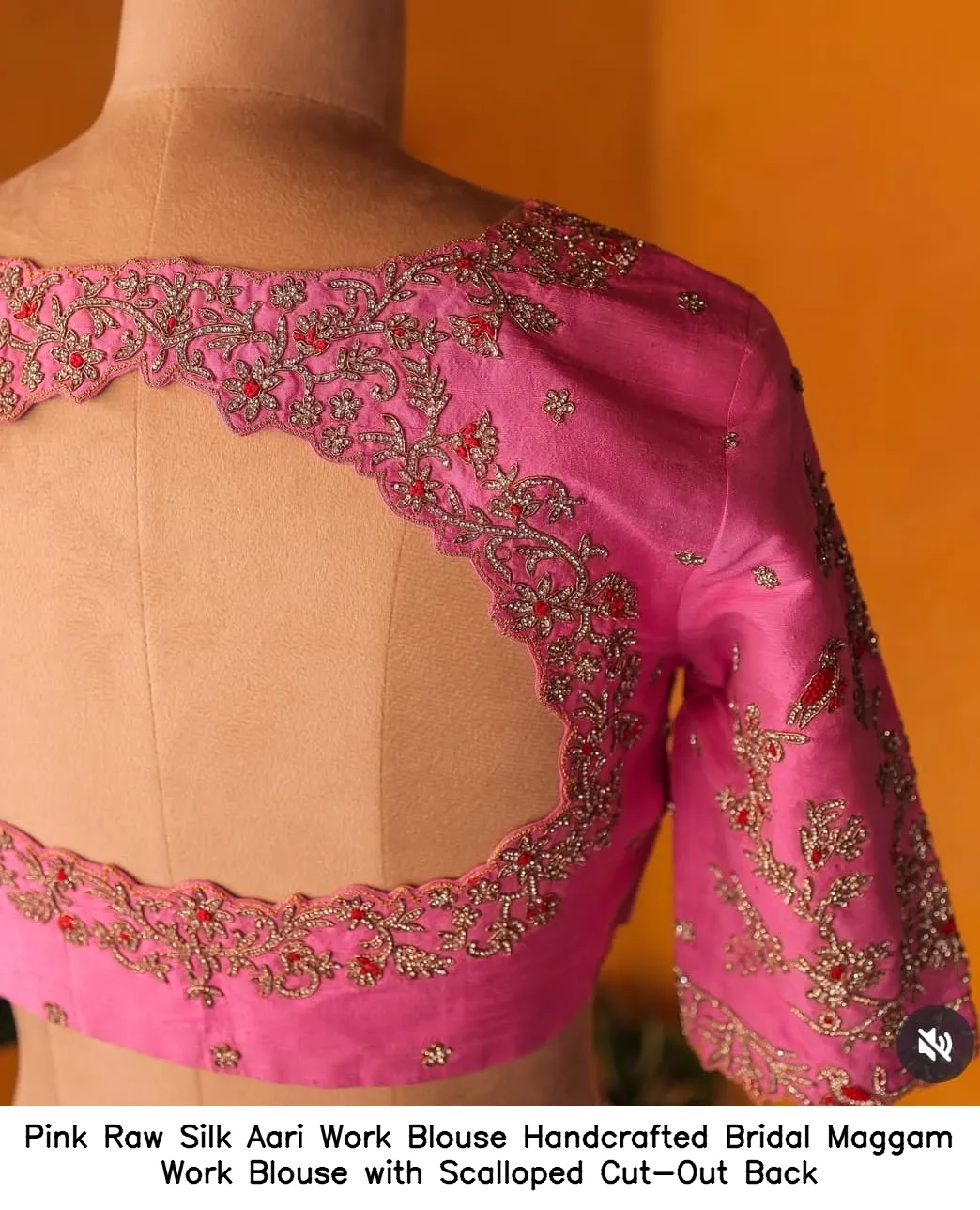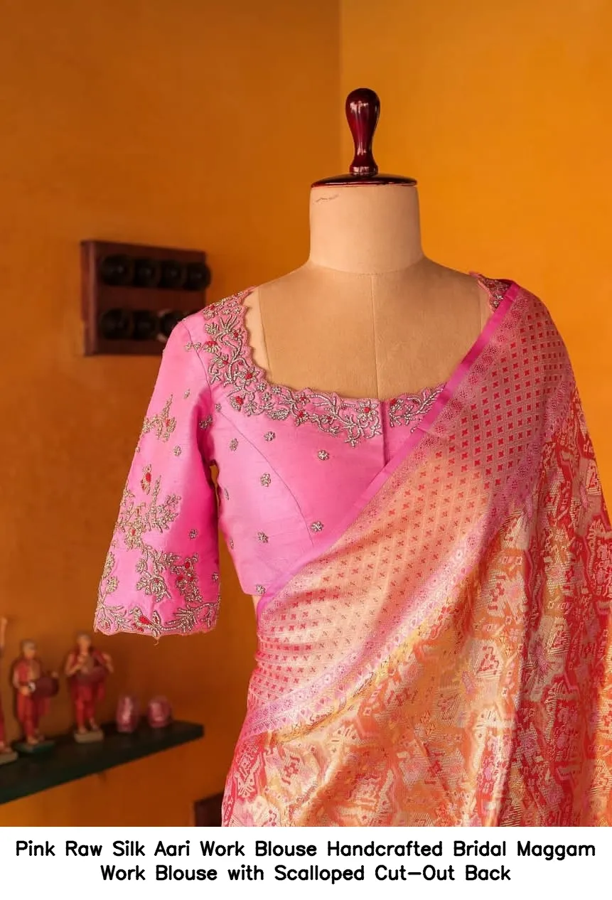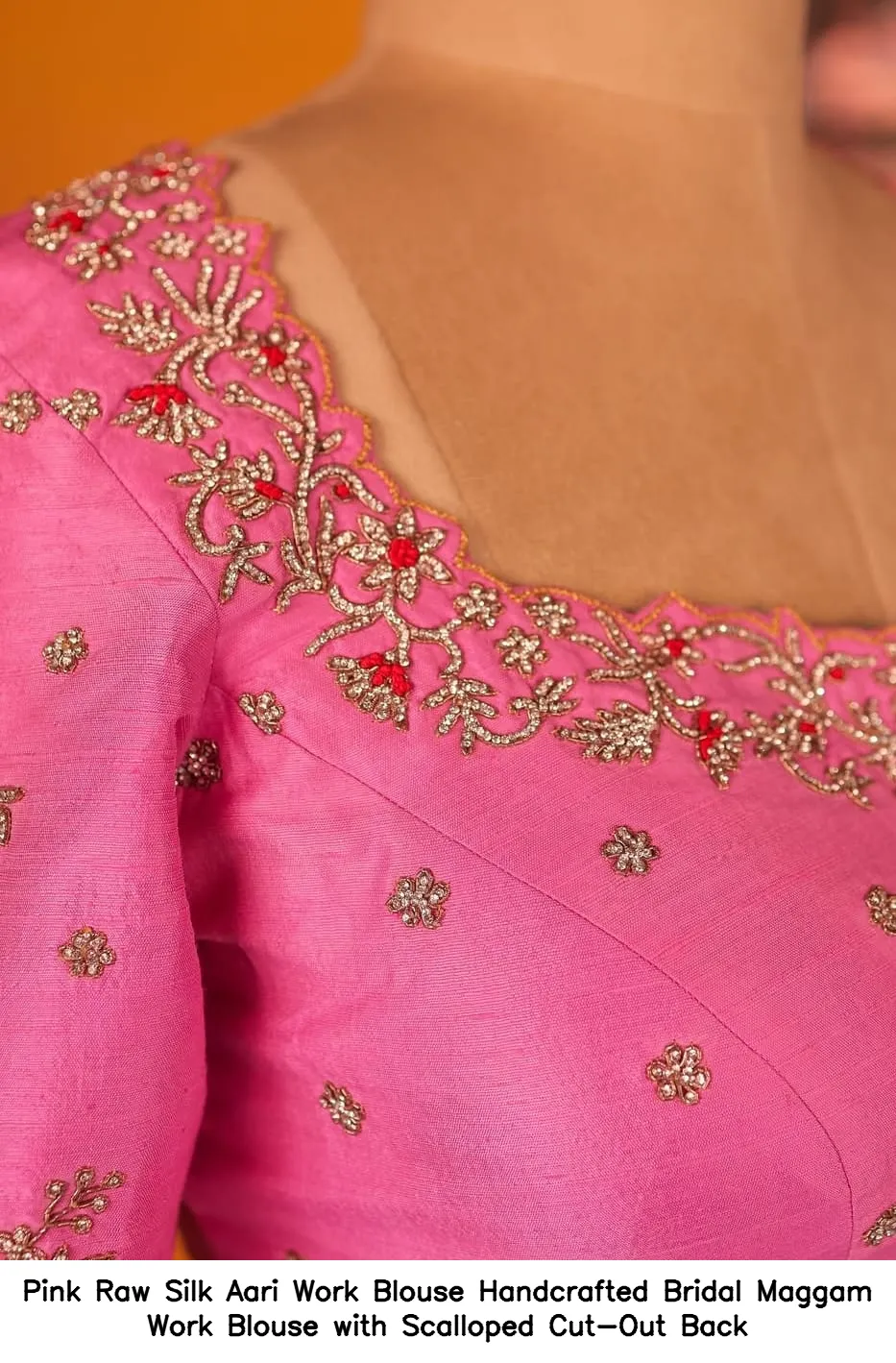 Pink Raw Silk Aari Work Blouse – Handcrafted Bridal Maggam Work Blouse with Scalloped Cut-Out Back