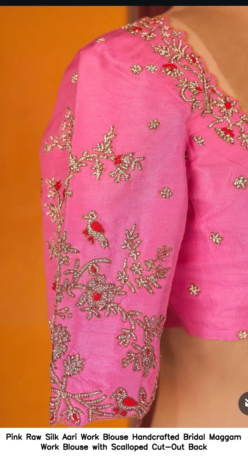 Introducing the exquisite Pink Raw Silk Aari Work Blouse – Handcrafted Bridal Maggam Work Blouse with Scalloped Cut-Out Back. This stunning blouse is perfect for brides looking to make a statement on their special day. Its intricate Aari work and scalloped back design add a touch of elegance to any outfit.