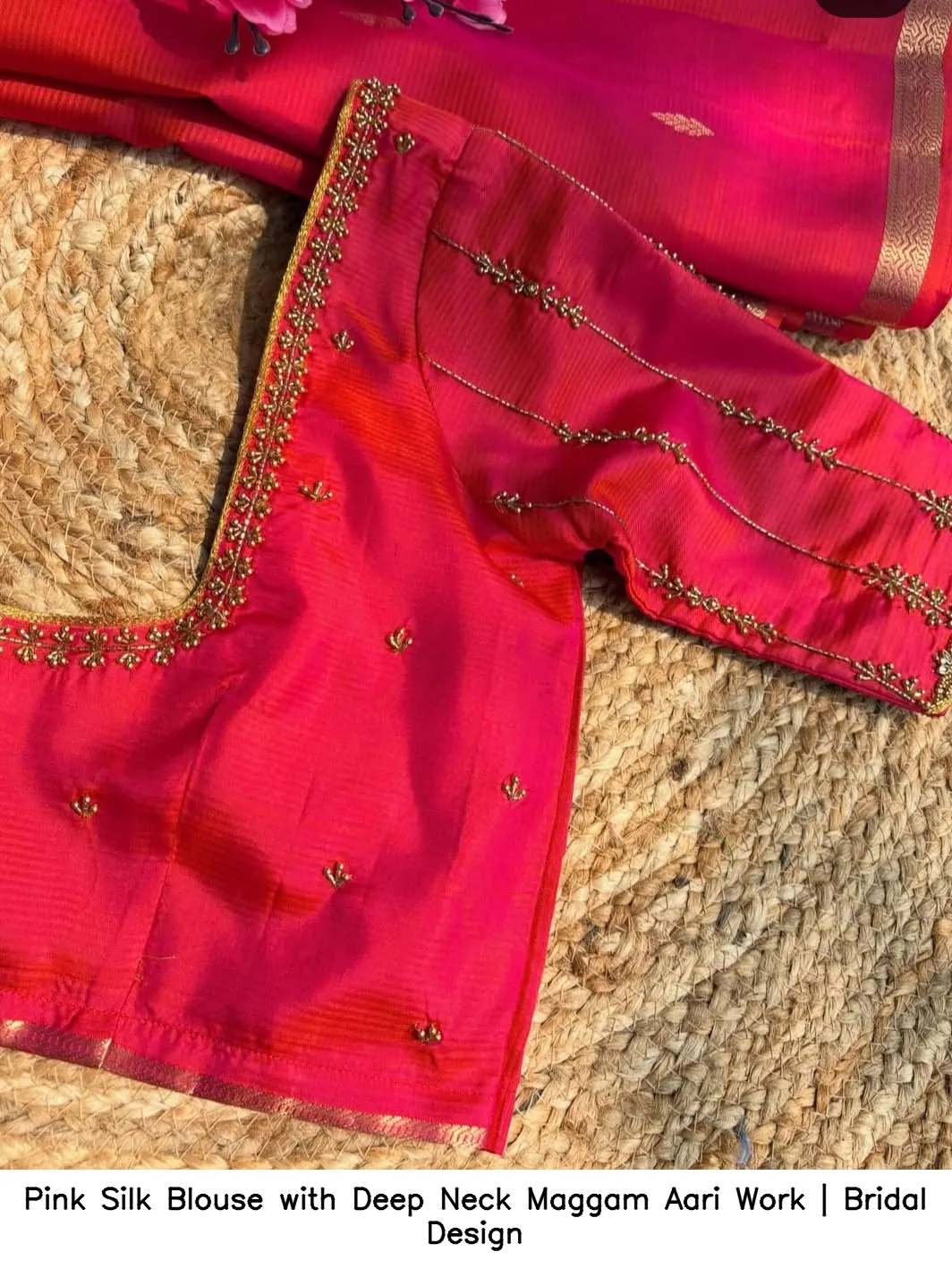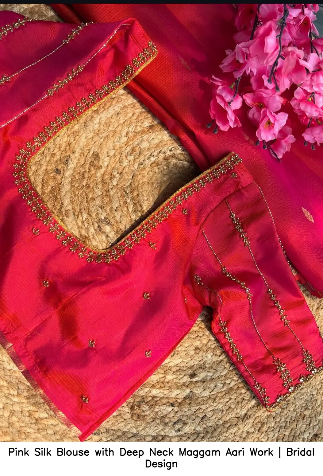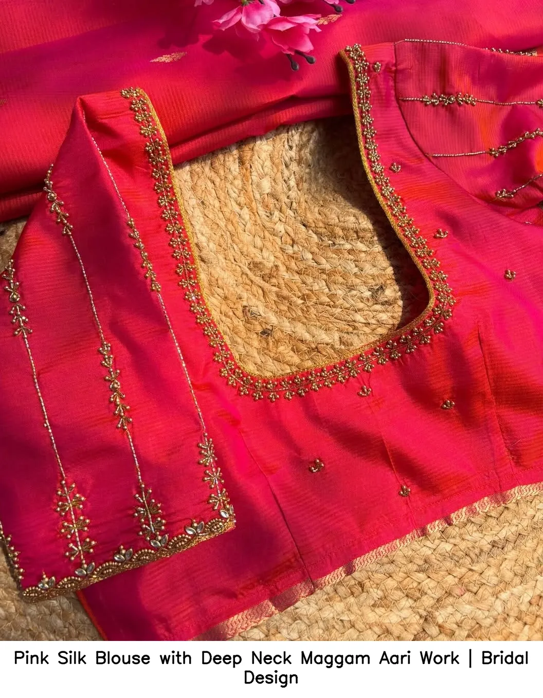 Pair your Pink Silk Blouse with Deep Neck Maggam Aari Work | Bridal Design with stunning accessories for a complete look. Follow us on social media to stay updated on the latest trends. Follow us on Facebook for more inspiration!