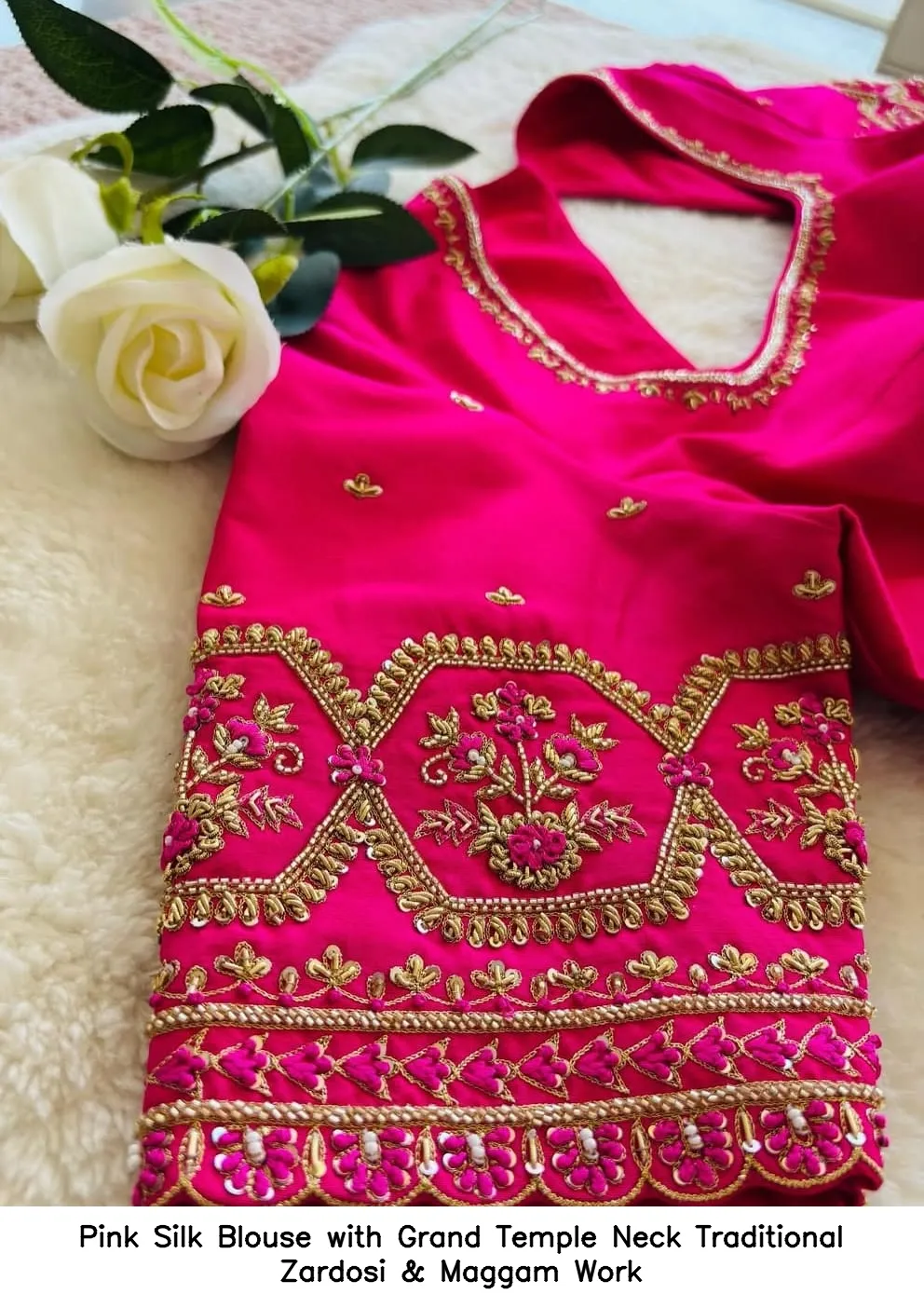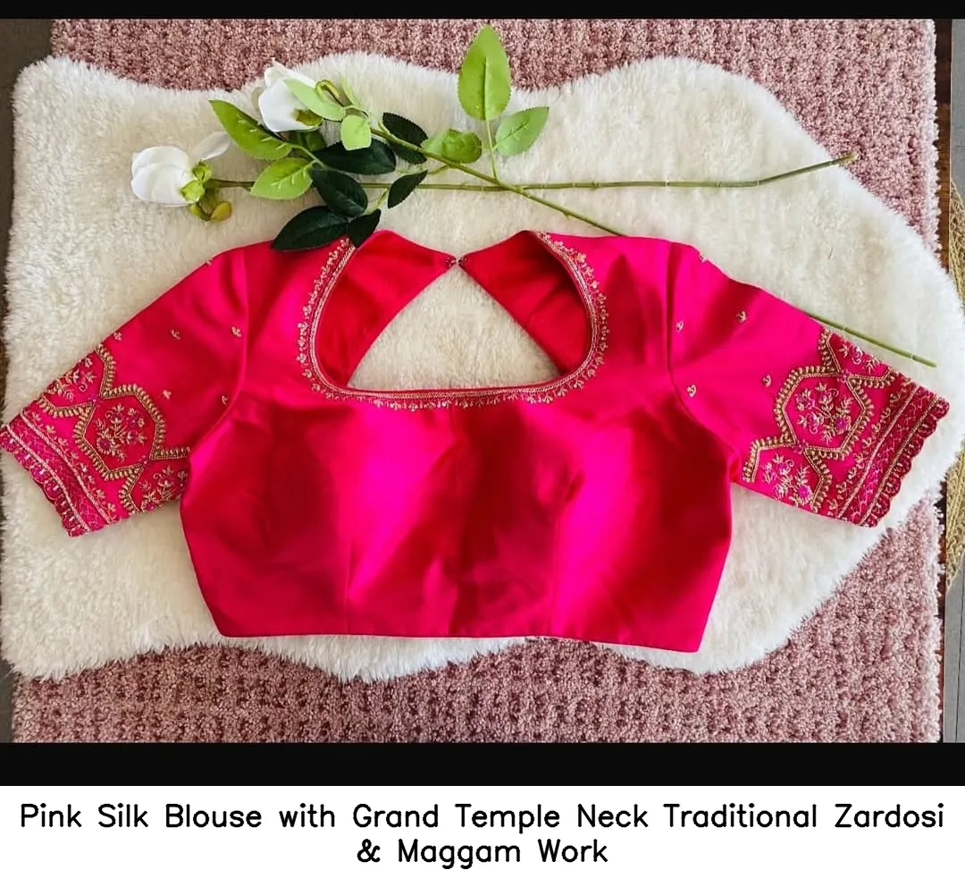 Pink Silk Blouse with Grand Temple Neck – Traditional Zardosi & Maggam Work is a stunning addition to your wardrobe. This blouse combines elegance and tradition effortlessly. Moreover, the intricate Zardosi and Maggam work enhances its charm, making it perfect for special occasions.