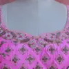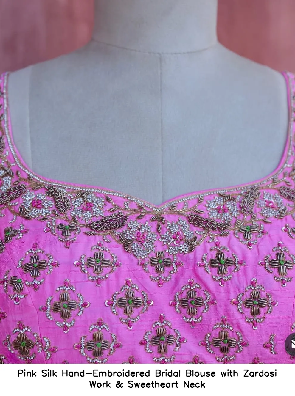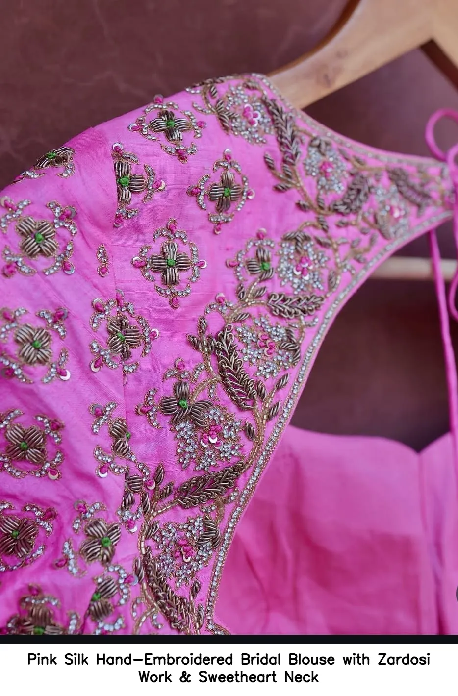 To maintain the beauty of your Pink Silk Hand-Embroidered Bridal Blouse with Zardosi Work & Sweetheart Neck, gentle hand wash is recommended. Avoid harsh detergents and direct sunlight to preserve the vibrant colors and intricate embroidery.