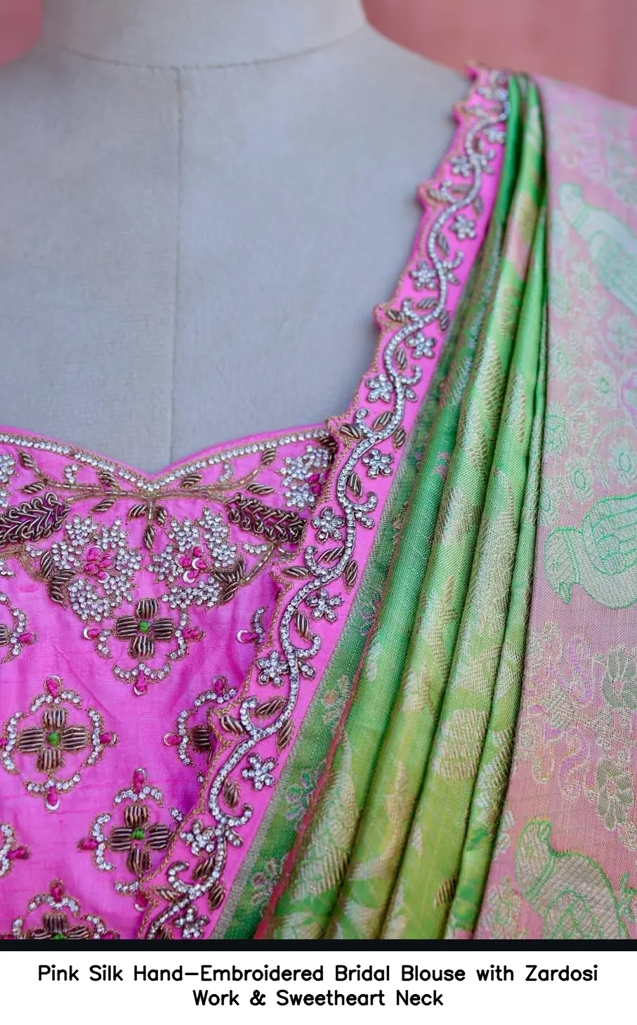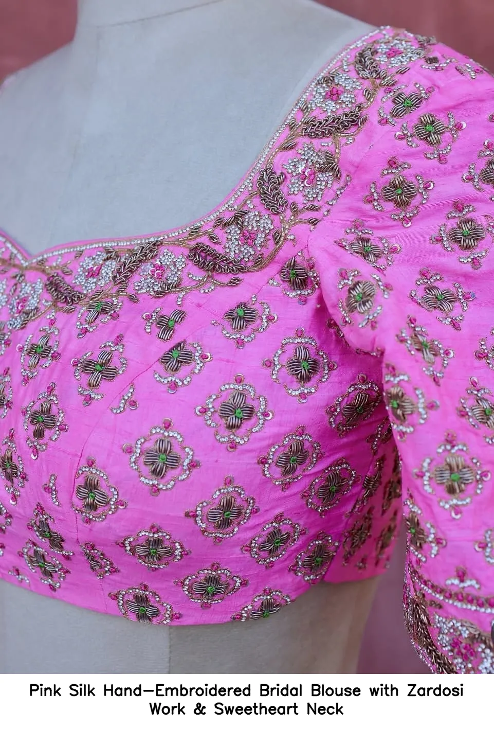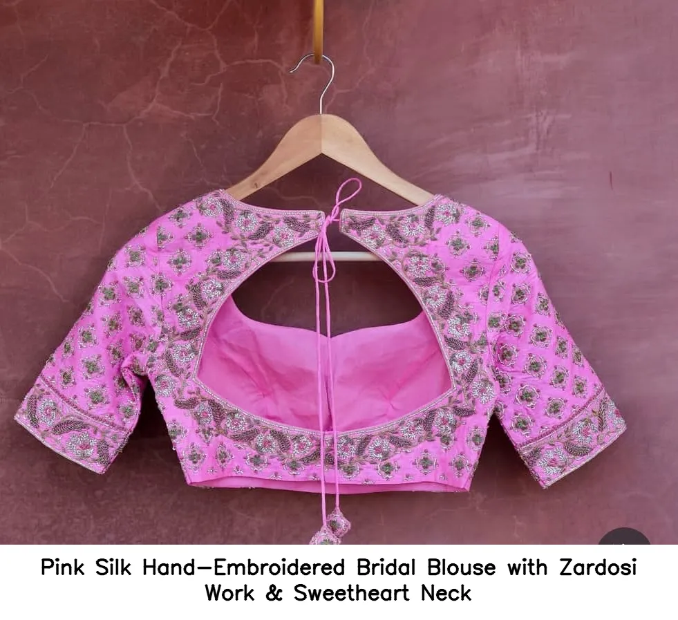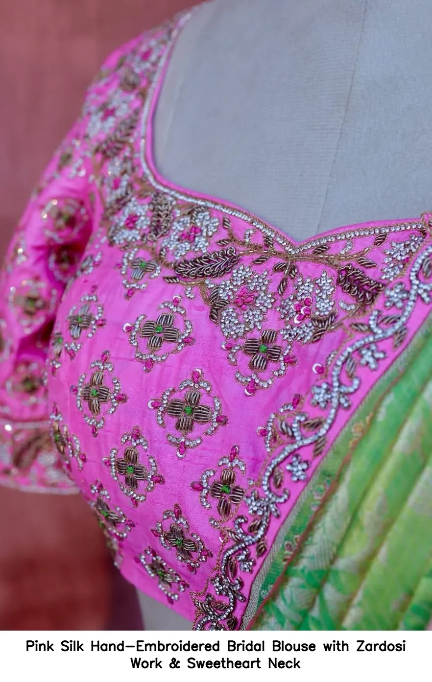 Pink Silk Hand-Embroidered Bridal Blouse with Zardosi Work & Sweetheart Neck