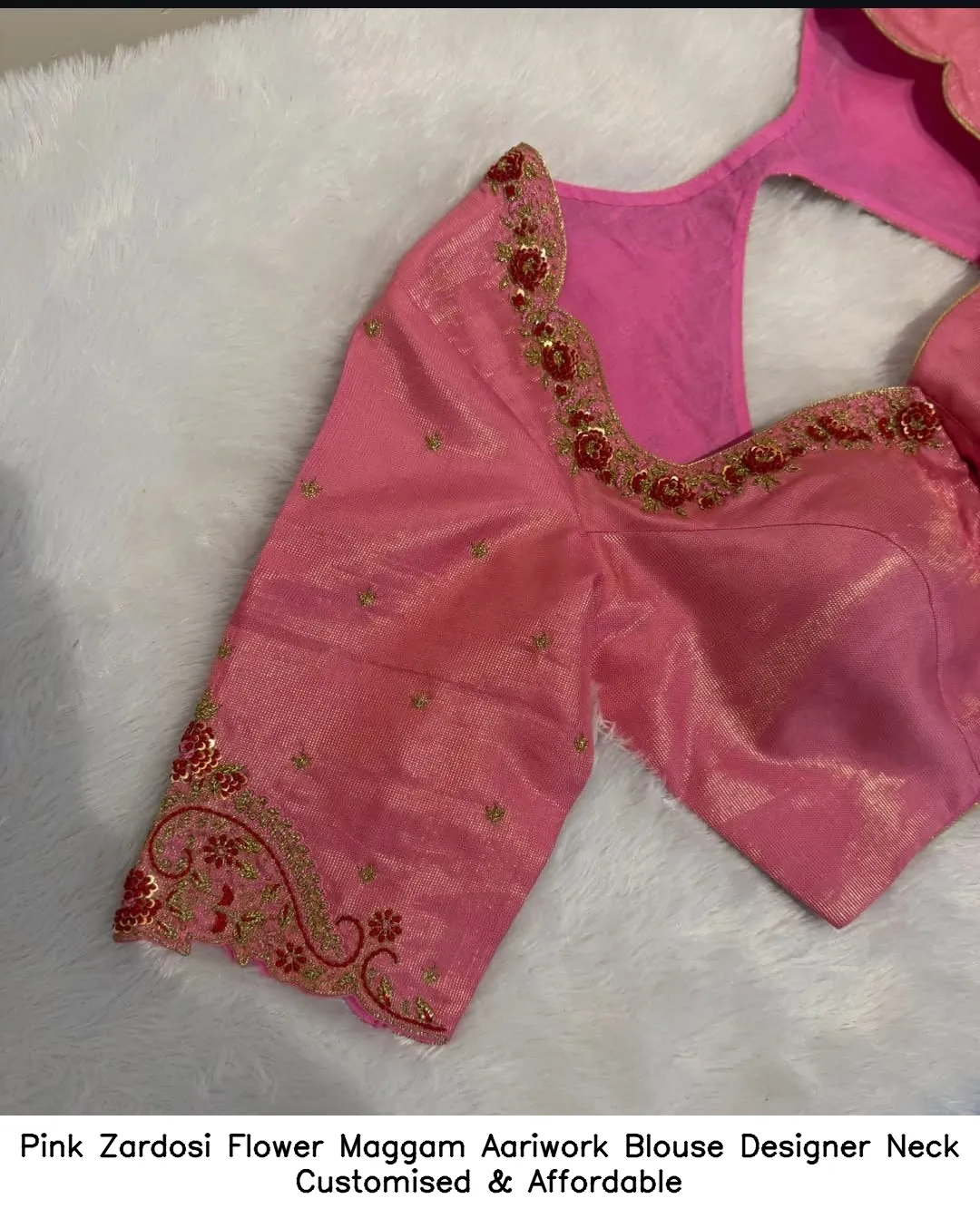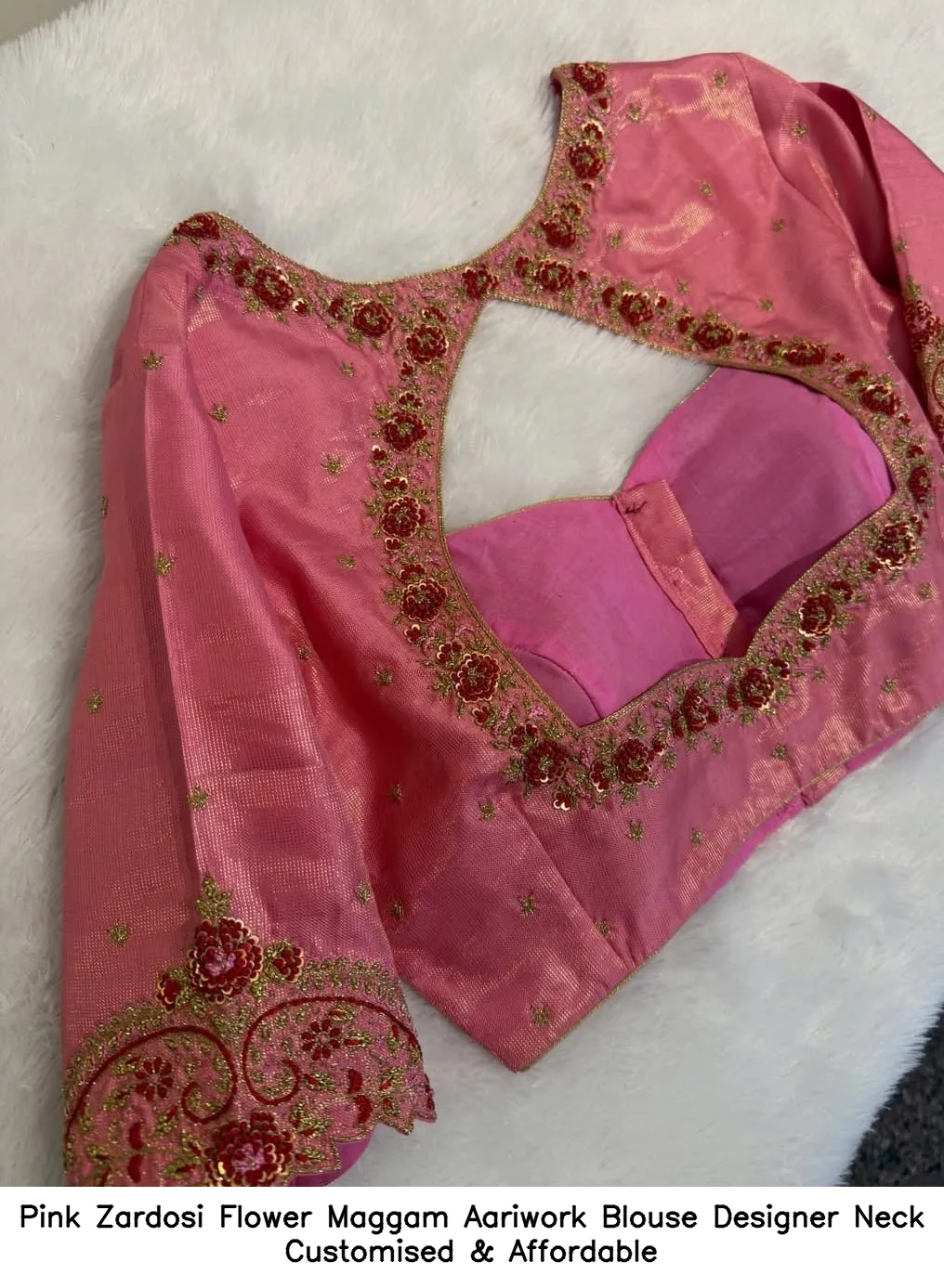Pink Zardosi Flower Maggam Aariwork Blouse – Designer Neck Customised & Affordable