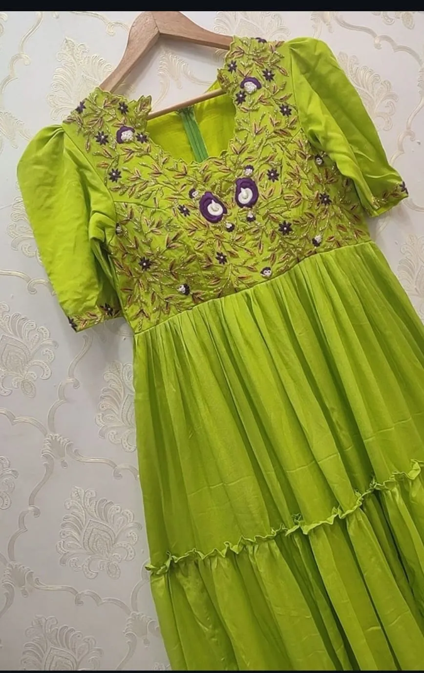 Q: What material is used for the Pista Green Designer Long Frock with Maggam Aari Work Customised Affordable Online?