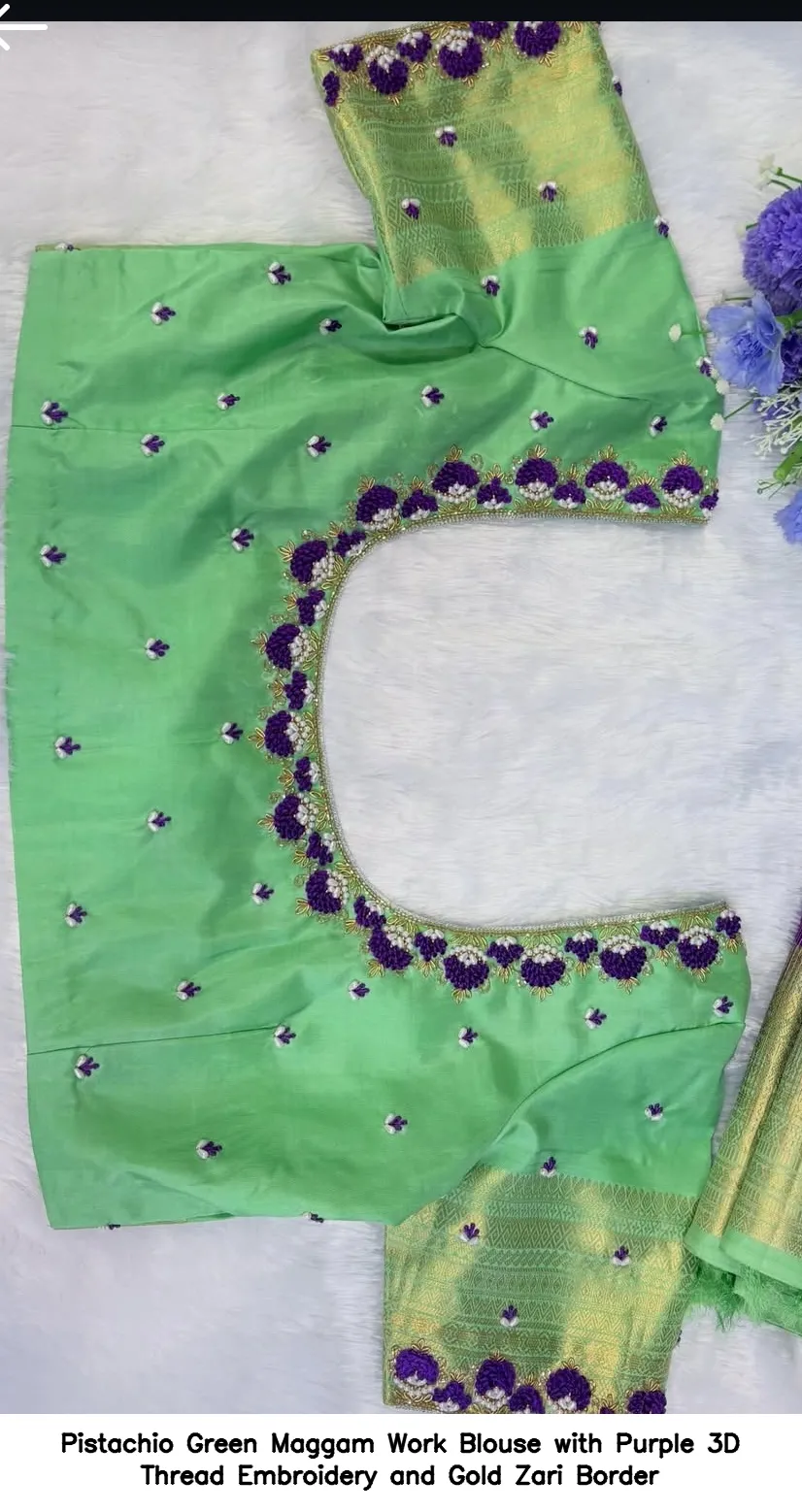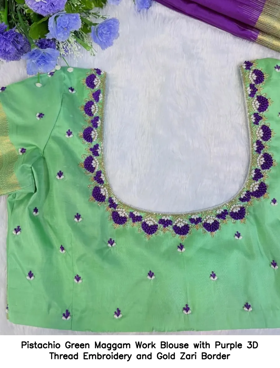 Introducing the stunning Pistachio Green Maggam Work Blouse with Purple 3D Thread Embroidery and Gold Zari Border. This exquisite blouse combines traditional craftsmanship with modern elegance. Designed to elevate your outfit, it is perfect for festive occasions and celebrations.