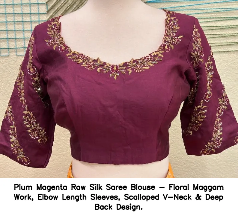 Introducing the exquisite Plum Magenta Raw Silk Saree Blouse – Floral Maggam Work, Elbow Length Sleeves, Scalloped V-Neck & Deep Back Design. This stunning blouse is perfect for any festive occasion or celebration. Crafted from luxurious raw silk, it features intricate floral maggam work that adds a touch of elegance and charm.