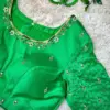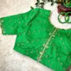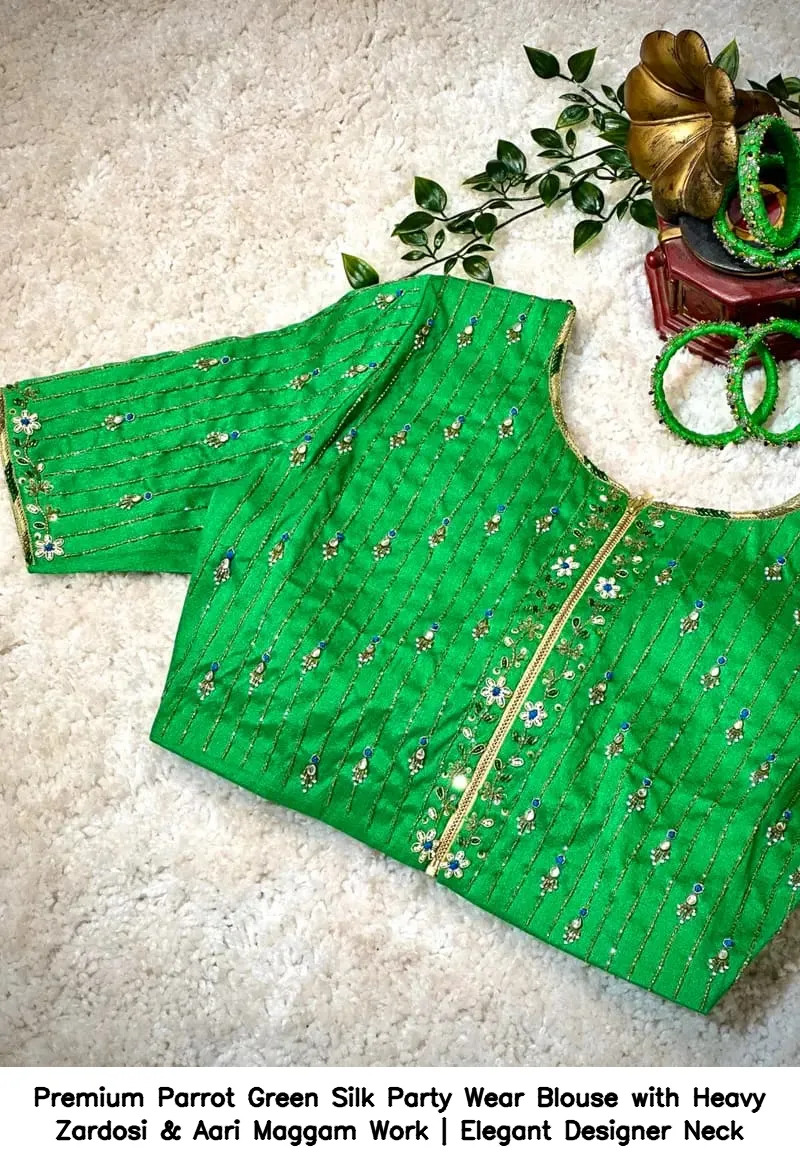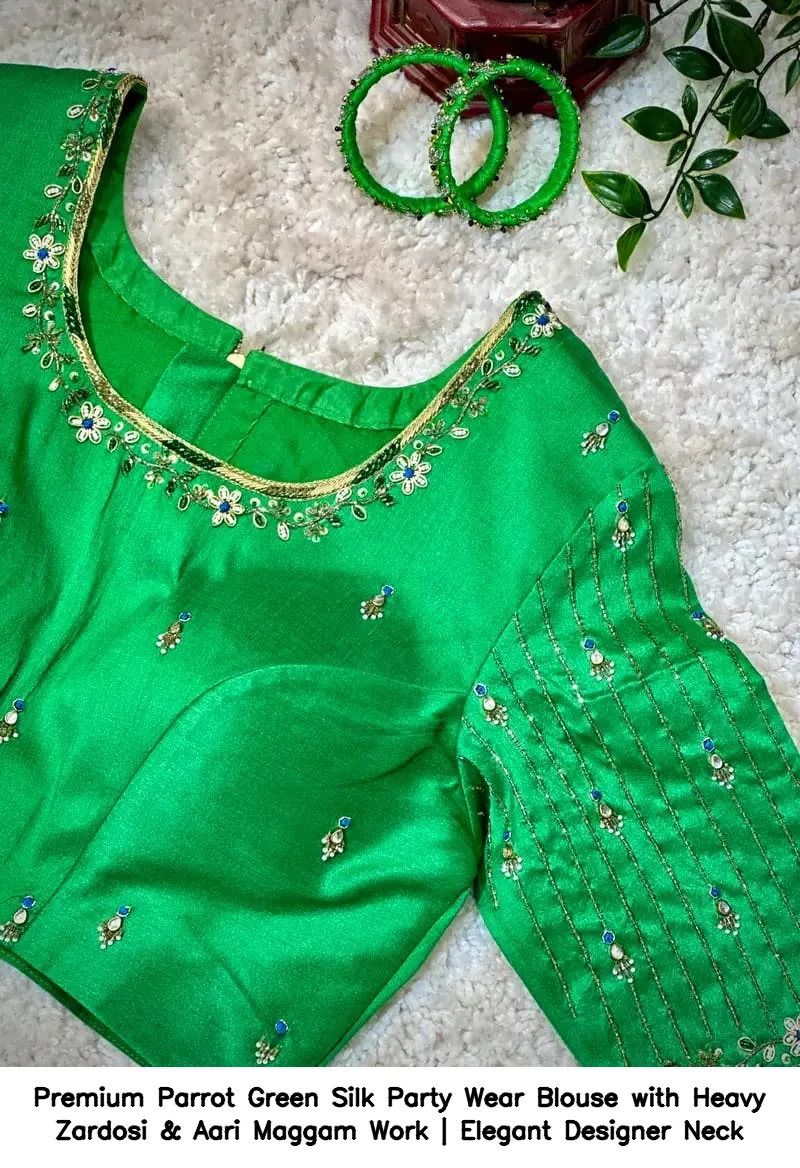 Product Name: ​Premium Parrot Green Silk Party Wear Blouse with Heavy Zardosi & Aari Maggam Work | Elegant Designer Neck