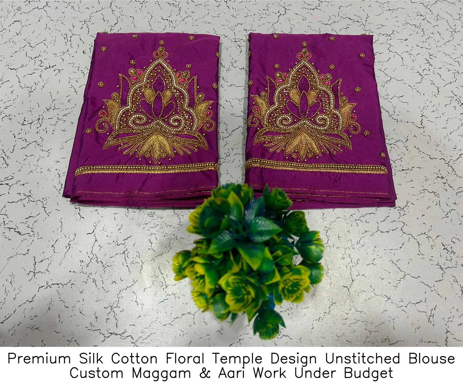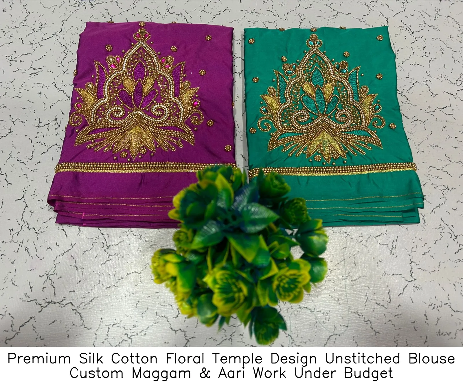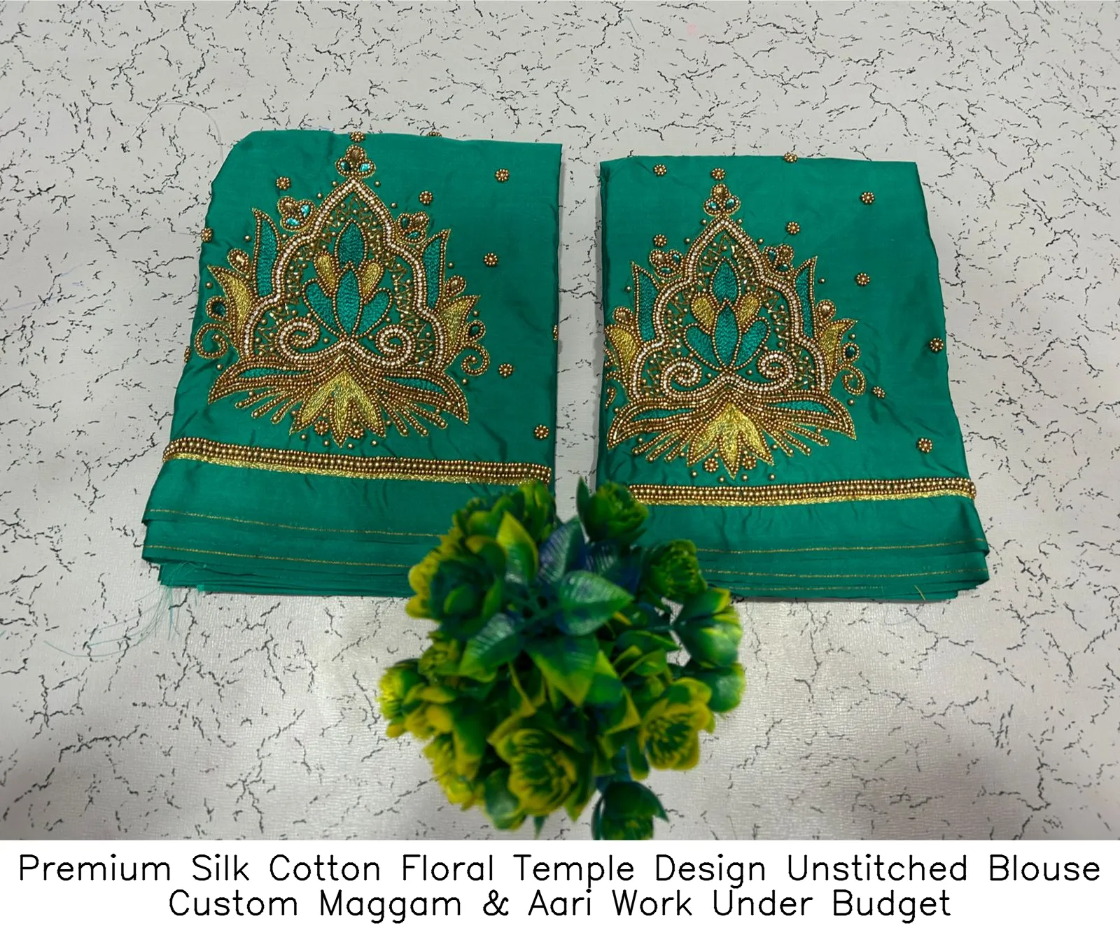 Premium Silk Cotton Floral Temple Design Unstitched Blouse – Custom Maggam & Aari Work Under Budget
